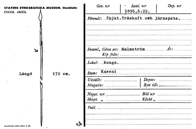 Gen. n:r - SamL n:r I Dep. n:r 1896,, 6.22 Föremål: Spjut .Träskaft oh ärns pe ts STATENS ETNOGRAFISKA MUSEUM, Stockholm ETNOGR. ARKEOL Längd Insaml, Gåva av: bialms tr ö m Köp från: Lokal: Kongo . ...