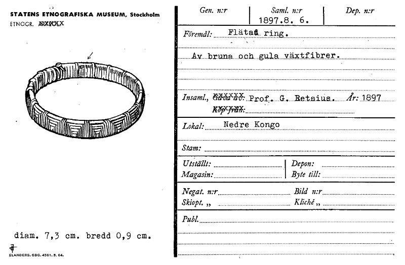 STATENS ETNOGRAFISKA MUSEUM, Stockholm ETNOGR. XRICSMC Gen. n:r Samlwr 1897.8. 6. Dep. n:r i Fbremål: Flätat ring. _ ', • Av_bruna. och. gula växtfibrer. Imrami, 6W2g...Prof, G... Sgt.aiå.s . A4: ...
