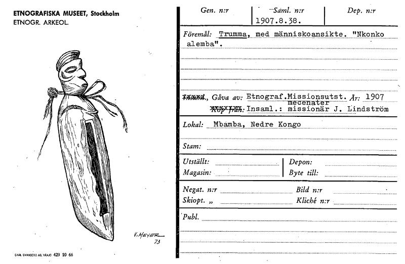 Gen. n:r ---Sciml. 'n:r Dep. n:r 1907.8.38. i Föremål: Trumma, med människoansikte. "Nkonko al emba" . ETNOGRAFISKA MUSEET, Stockholm ETNOGR. ARKEOL. 7,3 siad., Gåva av: Etnograf .Missionsutst . År: ...