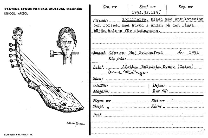 • STATENS ETNOGRAFISKA MUSEUM, Stockholm ETNOGR. ARKEOL. Gen. n:r I Saml. n:r I Dep. n:r I 1954.32.115:- I Föremål: Kondiharpa. Klädd med antilopskinn och- försedd med huvud i ändan på den långa, böjda... Visa hela