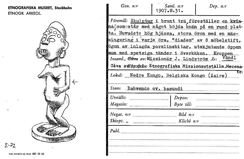 ETNOGRAFISKA MUSEET, Stockholm ETNOGR. ARKEOL CARL SVANBERG AB, VÄXJÖ 429 10 66 Gen. n:r Saml. n:r 1907 • £3.31. Dep. n:r Föremål: Skulptur i brant trälröreställer nåA'Isoniostår med något böjda knän ...