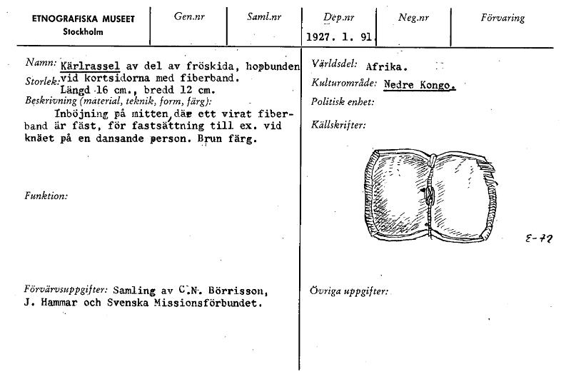 ETNOGRAFISKA MUSEET Stockholm Gen.nr Saml.nr Dep.nr 1927. 1. 91 Neg.nr Förvaring Ahonn :hrlrassel av del av fröskida, hopbunden Storlek. .vid kortsidorna med fiberband. Längd-16 cm., bredd 12 cm. Beskrivning (material, teknik, form, färg): Inböjning på mitten/där ett virat fiber- band år fäst, för fastsättning till ex. vid knäet på en dansande person. Brun färg. Funktion: Förvärvsuppgifter: Samling av C.N-. Börrisson, J. Hammar och Svenska Missionsförbundet. Världsdel: Afrika. Kulturområde: Nedre Kongo. Politisk enhet: Källskrifter: 5- 71? Övriga uppgifter: . [ocr]