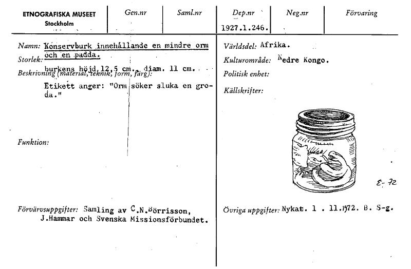 ETNOGRAFISKA MUSEET Stockholm Gen.nr Saml.nr Dep.nr 1927.1.246. Neg.nr Förvaring Namn: 1(tiservburk innehållande en mindre orm Storlek. öch :en ,padda. BeskrivnkrOziffirtiWthrlik%re:rdrbaln. 11 cm. , Etikett anger: "Orm söker sluka en gro- Funktion: Världsdel: Afrika. Kulturområde: Nedre Kongo. Politisk enhet: Källskrifter: E 7- Övriga uppgifter: Nykat. 1 . 11.1572. B. S-g . Förvärvsuppgifter: Samling av C.N.dörrisson, J.Hammar och Svenska Missionsförbundet. [ocr]Stäng