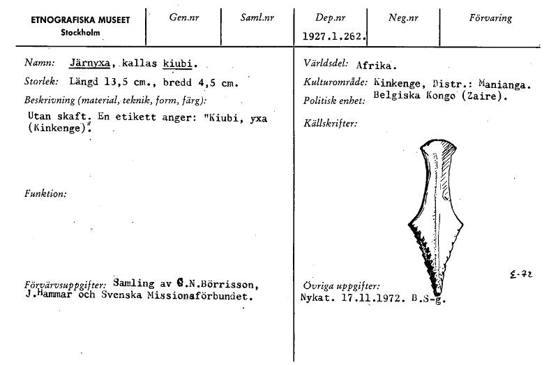 ETNOGRAFISKA MUSEET Stockholm Gen.nr Saml.nr Dep.nr 1927.1.262. Neg.nr Förvaring Namn: Järnyxa,.kallas kiubi. Storlek: Längd 13,5 cm., bredd 4,5 cm. Beskrivning (material; teknik, form, färg): Utan skaft. En etikett anger: "Kiubi, yxa (Kinkenge). . Funktion: Förvärvsuppgifter: Samling av C.N.Börrisson, J.Hammar och Svenska Missionaförbundet. Världsdel: Afrika. Kulturområde: Kinkenge, Manianga. Politisk enhet: Belgiska Kongo. (Zaire). Källskrifter: Övriga uppgifter: Nykat. 17.11.1972. B.S- [ocr]
