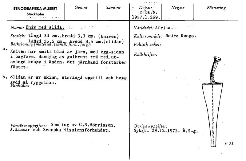 ETNOGRAFISKA MUSEET Stockholm Gen.nr Saml.nr Dep.nr' crAA.b. 1927.1.269. Neg.nr Förvaring Namn: Knivsmed "slida..; Storlek: Längd 30 cm.,bredd 3,3 cm. (kniven) .Läftgd 26.5 cm-- redd..8.5 cm.(slidan) Beskrivning (materua, teknik; fobrm, jargy: a. Kniven har smitt blad av järn, med egg-sidan i bågform. Handtag av gulbrunt trä med_ut- svängd knopp i änden. Ett järnband förstärker fästet. b. Slidan är av skinn, utsvängd upptill och hops' tydd på ryggsidan. letzon: Förvärvsuppgifter: Samling av C.N.Börrisson, J.Hammar och Svenska Missionsförhuhdet. Världsdel: Afrika.' Kulturområde: Nedre Kongo. Politisk enhet: Källskrifter: Övriga uppgifter: Nykat. 28.12.1972. B.S-g. t- [ocr]