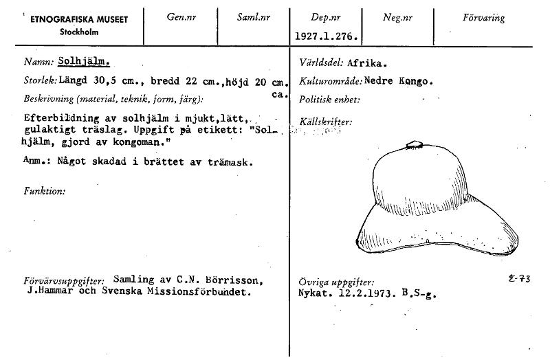 ETNOGRAFISKA MUSEET Stockholm Gen.nr Saml.nr Dep.nr 1927.1.276. Neg.nr Förvaring Namn: Solhjälm. Storlek: Längd 30,5 cm., bredd 22 cm. ,höjd 20 cm. Beskrivning (material, teknik, form, färg): ca. Efterbildning av solhjälm i mjukt,lätt,. - gulaktigt träslag. Uppgift på etikett: "Sol-, hjälm, gjord av kongoman." Anm.: Något skadad i brättet av trämask. Funktion: Förvärvsuppgifter: Samling av C.N. Börrisson, J.Hammar och Svenska Missionsförbundet. Världsdel: Afrika. Kulturområde: Nedre KQngo. Politisk enhet: Källskrifter: - •• Övriga uppgifter: t-33 Nykat. 12.2.1973. B.S—g. [ocr]