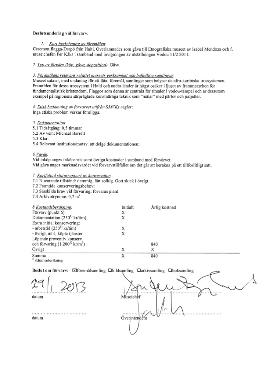 Beslutsunderlag för ceremoniflagga-Drapó från Haiti. Överlämnades som gåva till Etnografiska museet av Isabel Mendoza och f. museichefen Per Kåks i samband med invigningen av utställningen Vodou 11/2 2011.