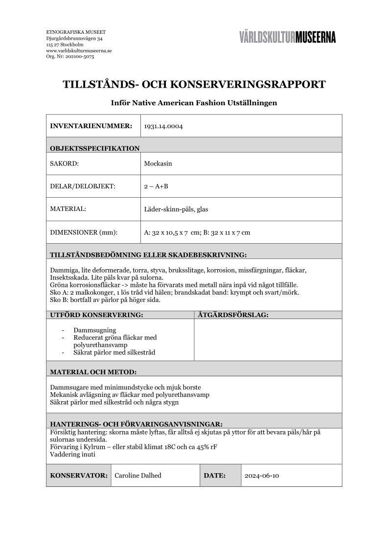 ETNOGRAFISKA MUSEET Djurgårdsbrunnsvägen 34 115 27 Stockholm www.varldskulturmuseerna.se Org. Nr: 202100-5075 TILLSTÅNDS- OCH KONSERVERINGSRAPPORT Inför Native American Fashion Utställningen INVENTARIENUMMER: 1931.14.0004 OBJEKTSSPECIFIKATION SAKORD: Mockasin DELAR/DELOBJEKT: 2 – A+B MATERIAL: Läder-skinn-päls, glas DIMENSIONER (mm): A: 32 x 10,5 x 7 cm; B: 32 x 11 x 7 cm TILLSTÅNDSBEDÖMNING ELLER...