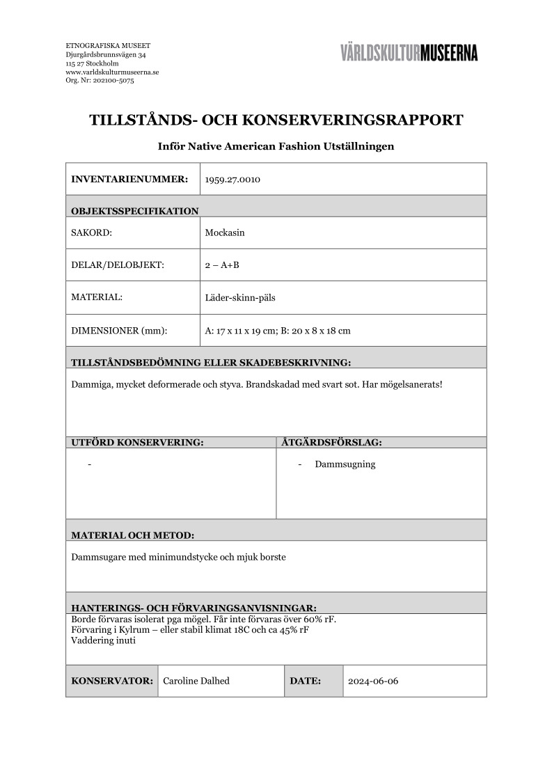 ETNOGRAFISKA MUSEET Djurgårdsbrunnsvägen 34 115 27 Stockholm www.varldskulturmuseerna.se Org. Nr: 202100-5075 TILLSTÅNDS- OCH KONSERVERINGSRAPPORT Inför Native American Fashion Utställningen INVENTARIENUMMER: 1959.27.0010 OBJEKTSSPECIFIKATION SAKORD: Mockasin DELAR/DELOBJEKT: 2 – A+B MATERIAL: Läder-skinn-päls DIMENSIONER (mm): A: 17 x 11 x 19 cm; B: 20 x 8 x 18 cm TILLSTÅNDSBEDÖMNING ELLER SKADEBESKRIVNING: Dammiga, mycket deformerade och styva. Brandskadad med svart sot. Har mögelsanerats! UTFÖRD KONSERVERING: ÅTGÄRDSFÖRSLAG: - - Dammsugning MATERIAL OCH METOD: Dammsugare med minimundstycke och mjuk borste HANTERINGS- OCH FÖRVARINGSANVISNINGAR: Borde förvaras isolerat pga mögel. Får inte förvaras över 60% rF. Förvaring i Kylrum – eller stabil klimat 18C och ca 45% rF Vaddering inuti KONSERVATOR: Caroline Dalhed DATE: 2024-06-06 ETNOGRAFISKA MUSEET Djurgårdsbrunnsvägen 34 115 27 Stockholm www.varldskulturmuseerna.se Org. Nr: 202100-5075 FOTOS Mockasin A ETNOGRAFISKA MUSEET Djurgårdsbrunnsvägen 34 115 27 Stockholm www.varldskulturmuseerna.se Org. Nr: 202100-5075 Mockasin B Mockasin A Mockasin BStäng