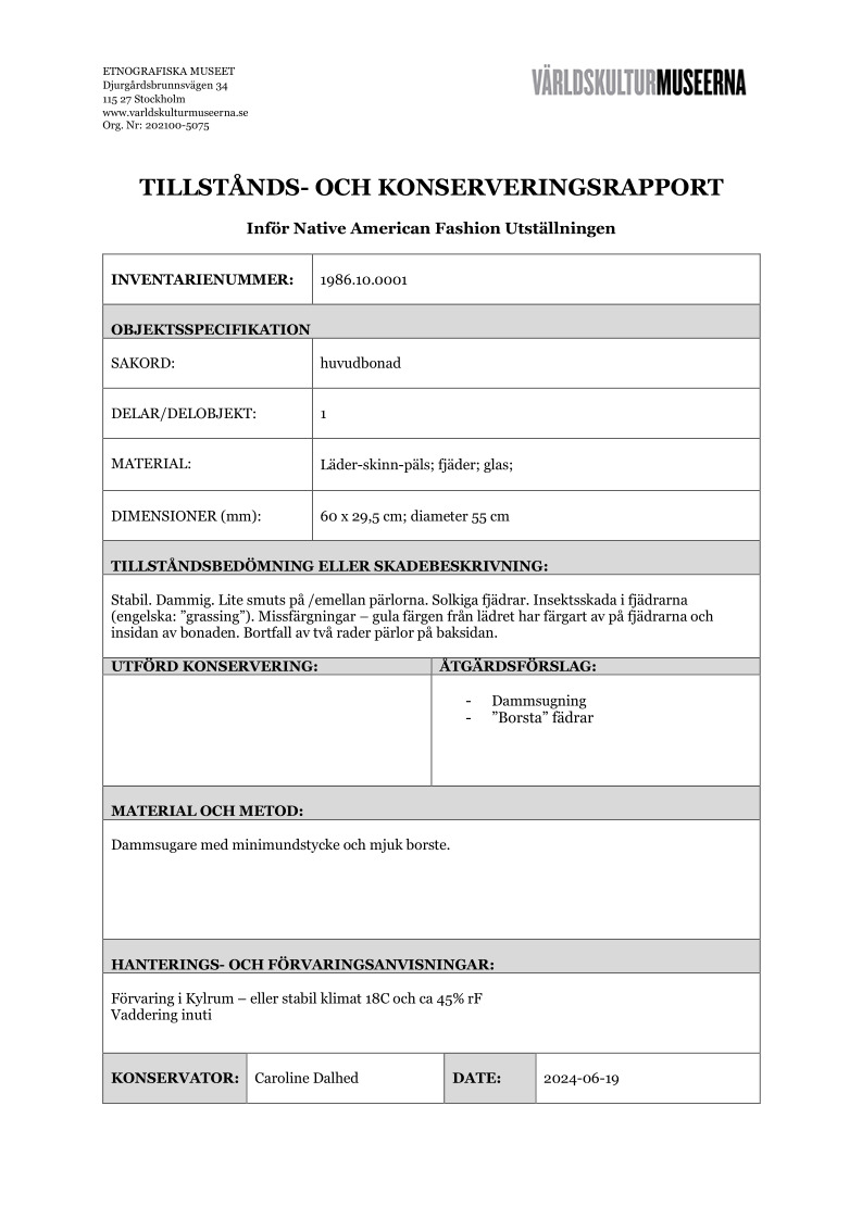 • ETNOGRAFISKA MUSEET Djurgårdsbrunnsvägen 34 115 27 Stockholm www.varldskulturmuseerna.se Org. Nr: 202100-5075 TILLSTÅNDS- OCH KONSERVERINGSRAPPORT Inför Native American Fashion Utställningen INVENTARIENUMMER: 1986.10.0001 OBJEKTSSPECIFIKATION SAKORD: huvudbonad DELAR/DELOBJEKT: 1 MATERIAL: Läder-skinn-päls; fjäder; glas; DIMENSIONER (mm): 60 x 29,5 cm; diameter 55 cm TILLSTÅNDSBEDÖMNING ELLER SKAD... Visa hela