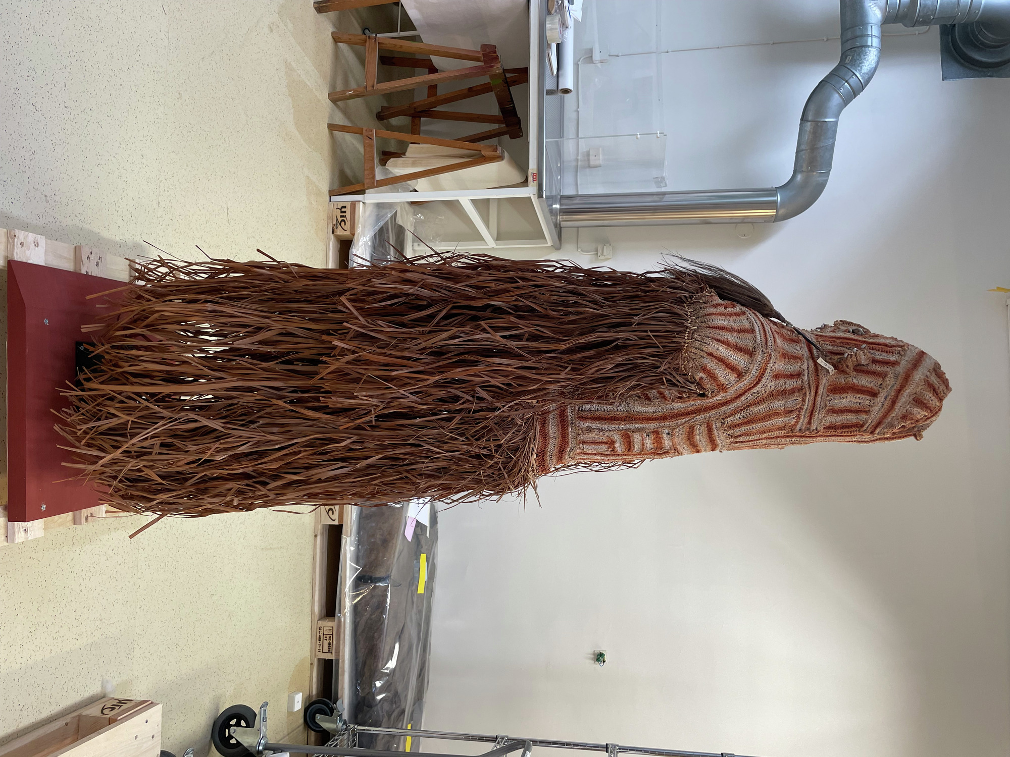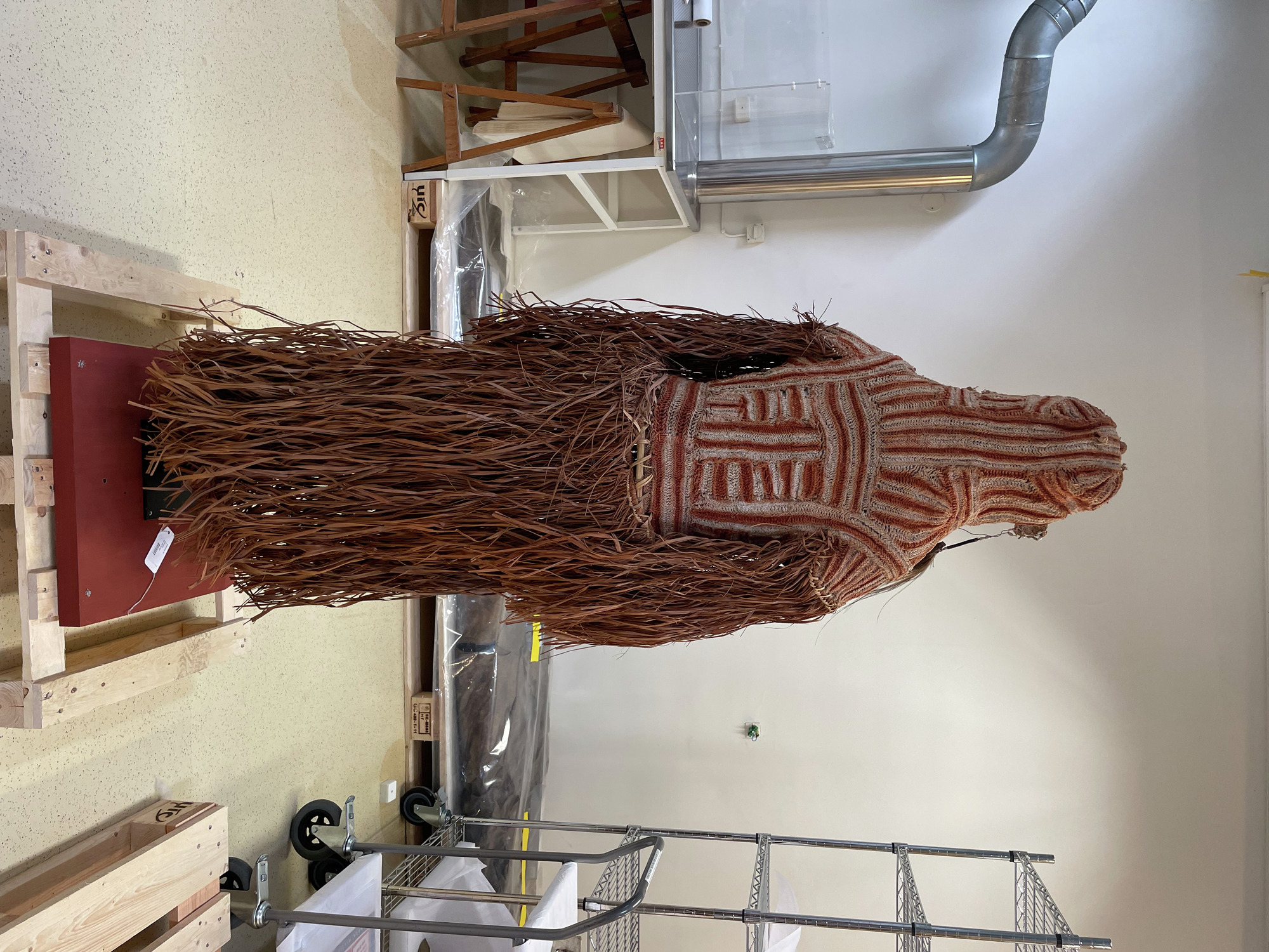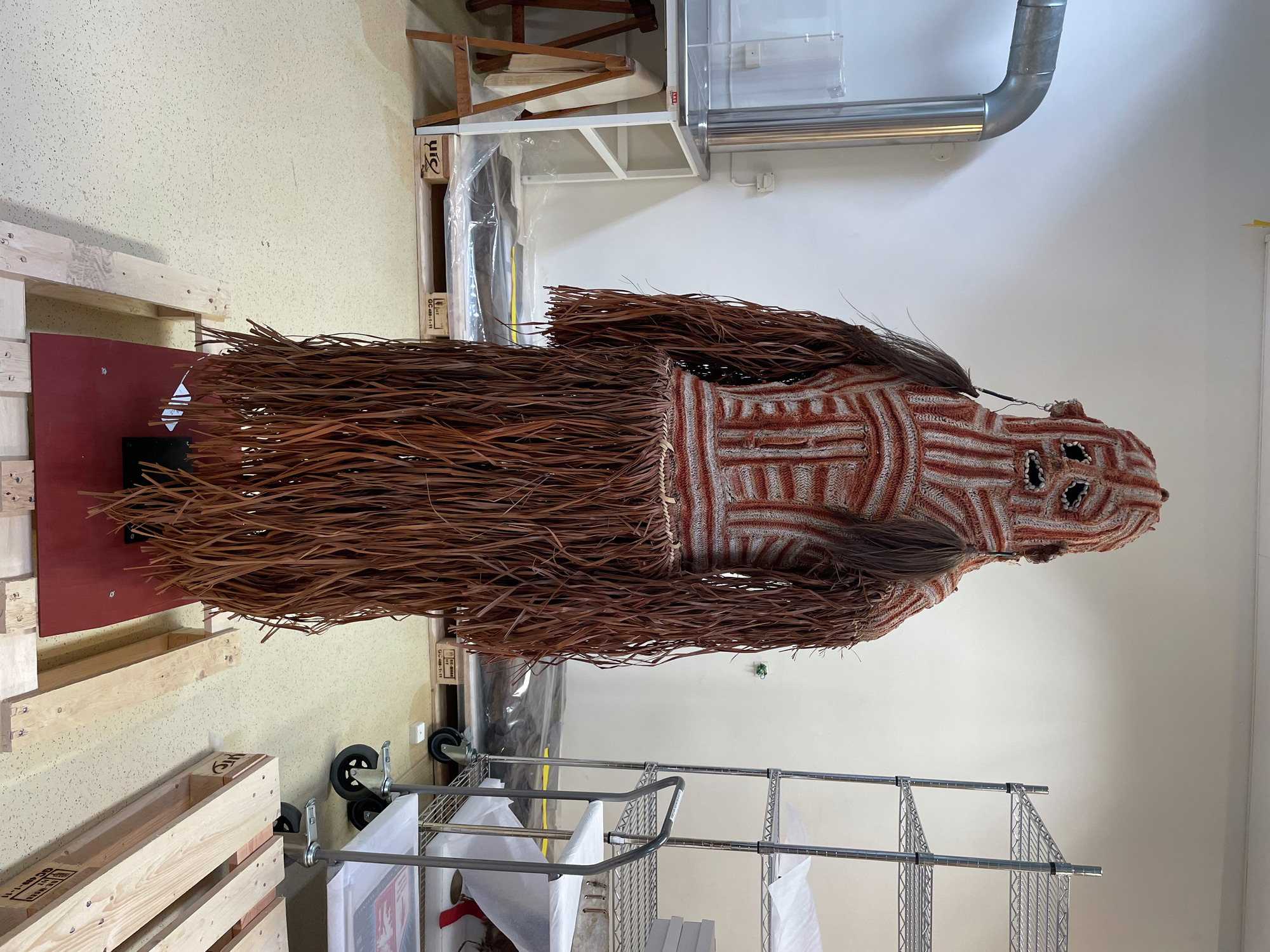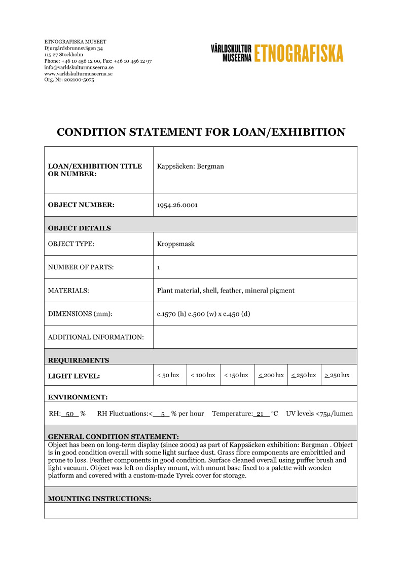 ETNOGRAFISKA MUSEET Djurgårdsbrunnsvägen 34 115 27 Stockholm Phone: +46 10 456 12 00, Fax: +46 10 456 12 97 infoldskulturmuseerna.se www.varldskulturmuseerna.se Org. Nr: 202100-5075 CONDITION STATEMENT FOR LOAN/EXHIBITION LOAN/EXHIBITION TITLE OR NUMBER: Kappsäcken: Bergman OBJECT NUMBER: 1954.26.0001 OBJECT DETAILS OBJECT TYPE: Kroppsmask NUMBER OF PARTS: 1 MATERIALS: Plant material, shell, feather, mineral pigment DIMENSIONS (mm): c.1570 (h) c.500 (w) x c.450 (d) ADDITIONAL INFORMATION: REQUIREMENTS LIGHT LEVEL: < 50 lux < 100 lux < 150 lux < 200 lux < 250 lux > 250 lux ENVIRONMENT: RH: 50 % RH Fluctuations:< 5 % per hour Temperature: 21 oC UV levels <75/lumen GENERAL CONDITION STATEMENT: Object has been on long-term display (since 2002) as part of Kappsäcken exhibition: Bergman . Object is in good condition overall with some light surface dust. Grass fibre components are embrittled and prone to loss. Feather components in good condition. Surface cleaned overall using puffer brush and light vacuum. Object was left on display mount, with mount base fixed to a palette with wooden platform and covered with a custom-made Tyvek cover for storage. MOUNTING INSTRUCTIONS: HANDLING INSTRUCTIONS: Grass fibre elements are fragile and prone to loss. Careful handling required to avoid loss of this material. SIGNATURE: CONSERVATOR: Peter McElhinney DATE: 22/02/2023 LENDER: DATE: GENERAL CONDITION STATEMENT AND COMMENTS AFTER LOAN/EXHIBITION: NOTES AND REMARKS: SIGNATURE: CONSERVATOR: DATE: LENDER: DATE: 1954.26.0001 1954.26.0001 BT 1954.26.0001 BT 1954.26.0001 BT 1954.26.0001 BT detail showing condition top of head 1954.26.0001 BT detail showing condition of face 1954.26.0001 BT detail showing condition of PR feather element 1954.26.0001 BT detail showing condition of PL feather elementStäng