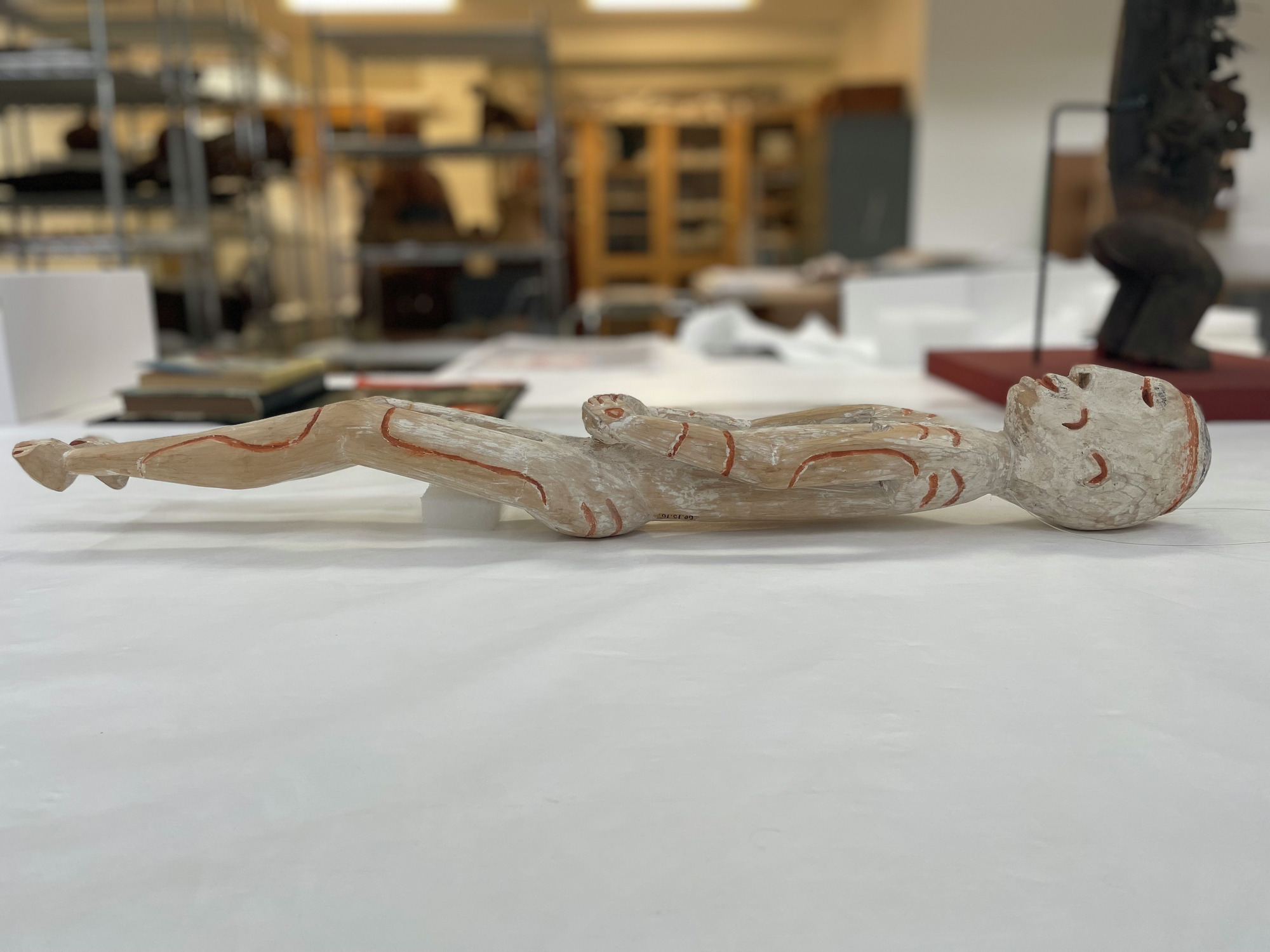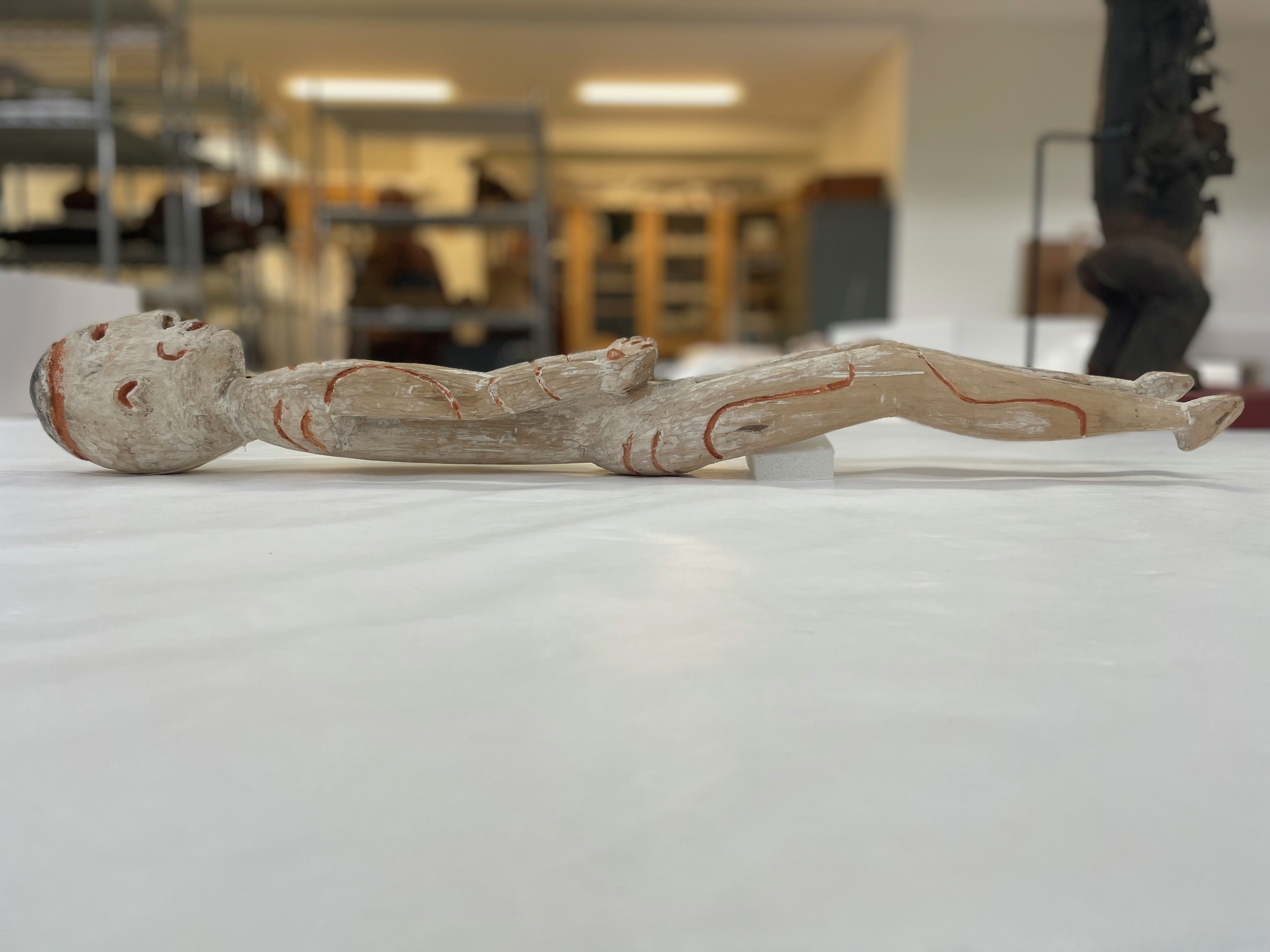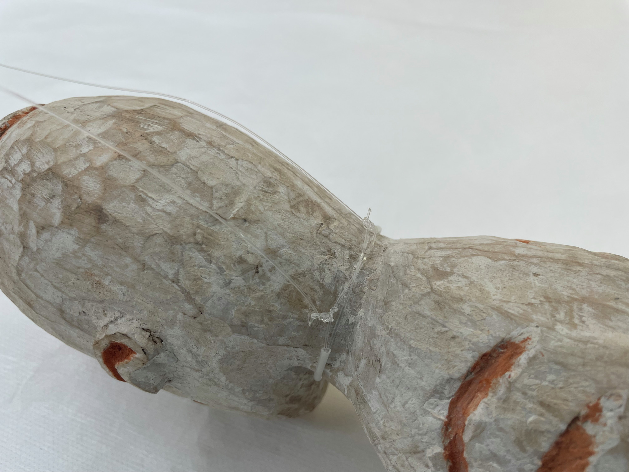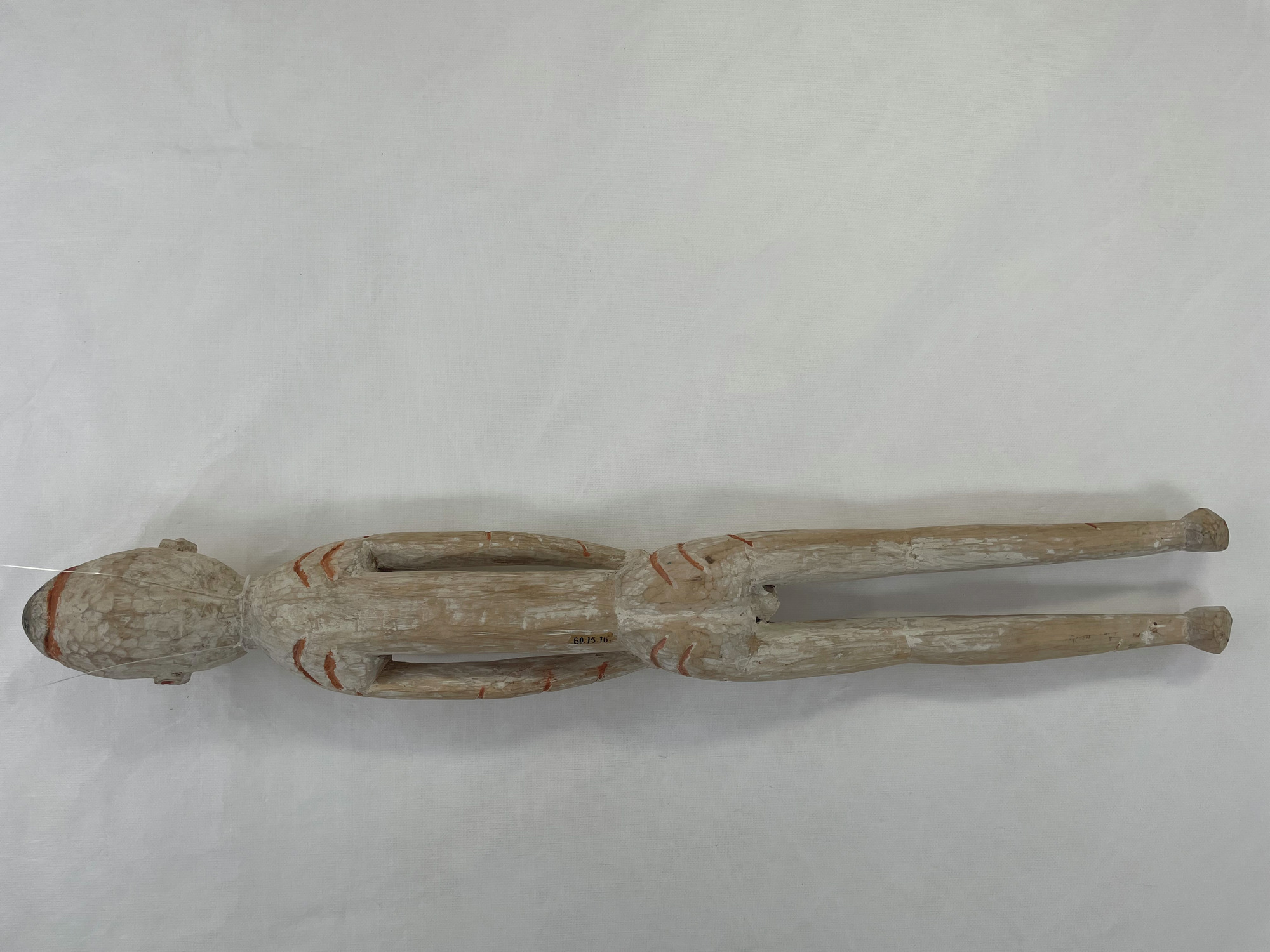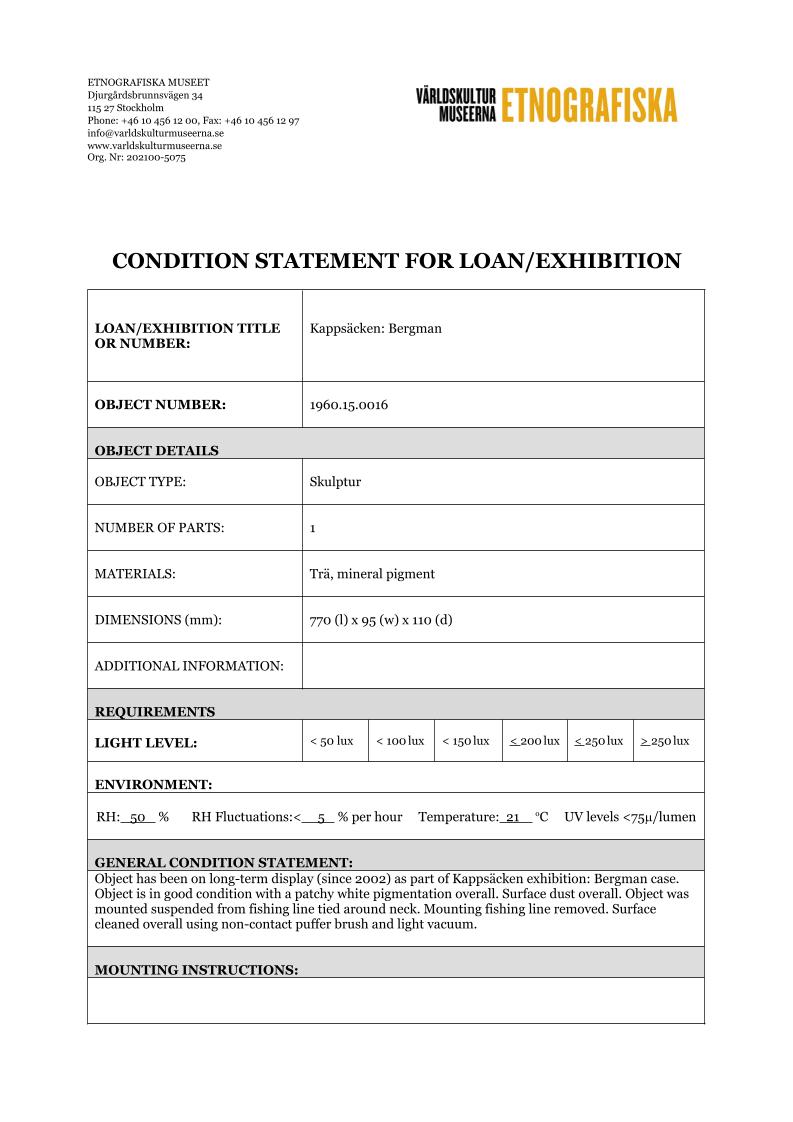 ETNOGRAFISKA MUSEET Djurgårdsbrunnsvägen 34 115 27 Stockholm Phone: +46 10 456 12 00, Fax: +46 10 456 12 97 infoldskulturmuseerna.se www.varldskulturmuseerna.se Org. Nr: 202100-5075 CONDITION STATEMENT FOR LOAN/EXHIBITION LOAN/EXHIBITION TITLE OR NUMBER: Kappsäcken: Bergman OBJECT NUMBER: 1960.15.0016 OBJECT DETAILS OBJECT TYPE: Skulptur NUMBER OF PARTS: 1 MATERIALS: Trä, mineral pigment DIMENSIONS (mm): 770 (l) x 95 (w) x 110 (d) ADDITIONAL INFORMATION: REQUIREMENTS LIGHT LEVEL: < 50 lux < 100 lux < 150 lux < 200 lux < 250 lux > 250 lux ENVIRONMENT: RH: 50 % RH Fluctuations:< 5 % per hour Temperature: 21 oC UV levels <75/lumen GENERAL CONDITION STATEMENT: Object has been on long-term display (since 2002) as part of Kappsäcken exhibition: Bergman case. Object is in good condition with a patchy white pigmentation overall. Surface dust overall. Object was mounted suspended from fishing line tied around neck. Mounting fishing line removed. Surface cleaned overall using non-contact puffer brush and light vacuum. MOUNTING INSTRUCTIONS: HANDLING INSTRUCTIONS: Please handle with care. Plant fibre decorative elements are embrittled, fragile, and prone to loss. SIGNATURE: CONSERVATOR: Peter McElhinney DATE: 09/02/2023 LENDER: DATE: GENERAL CONDITION STATEMENT AND COMMENTS AFTER LOAN/EXHIBITION: NOTES AND REMARKS: SIGNATURE: CONSERVATOR: DATE: LENDER: DATE: 1960.15.0016 Front BT 1960.15.0016 Back BT 1960.15.0016 right side BT 1960.15.0016 Left Side BT 1960.15.0016 Top BT 1960.15.0016 Bottom BT 1960.15.0016 detail BT showing mounting wire 1960.15.0016 detail AT showing removed mounting wire 1960.15.0014 detail BT showing mounting wire 1960.15.0014 detail AT showing removed mounting wireStäng
