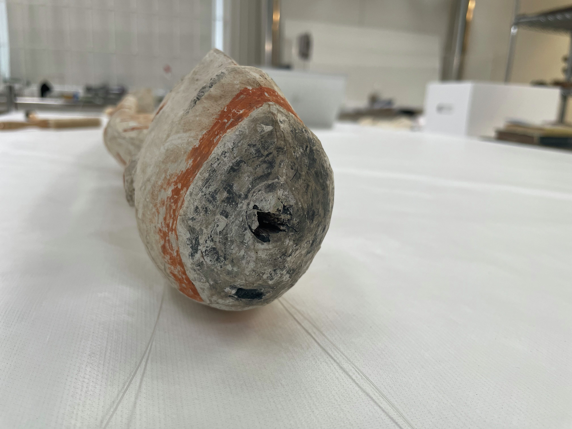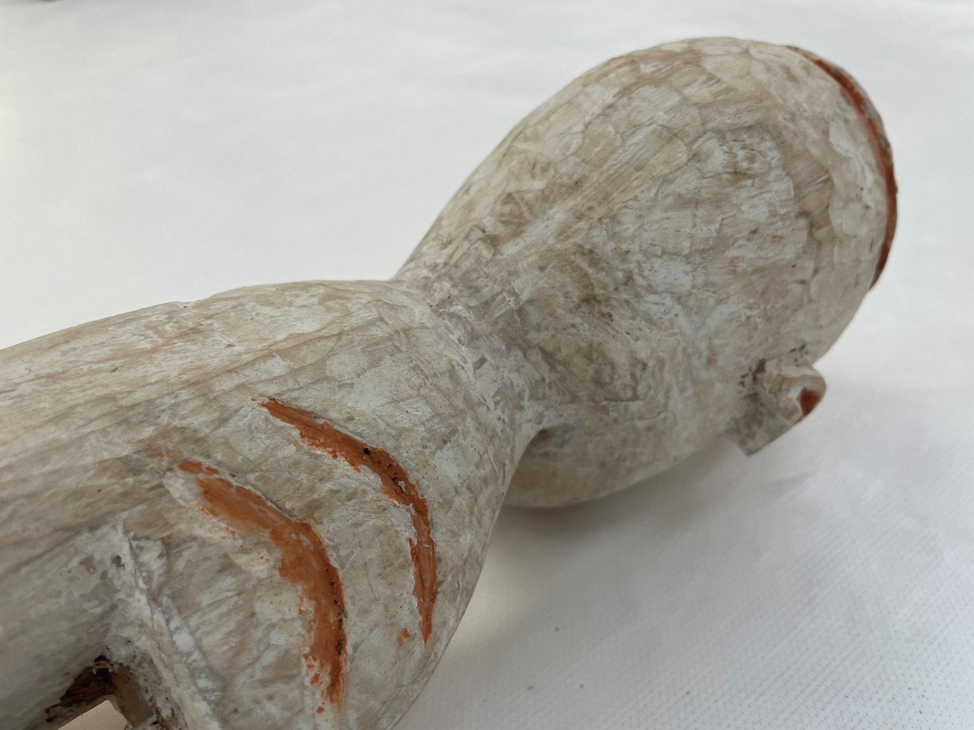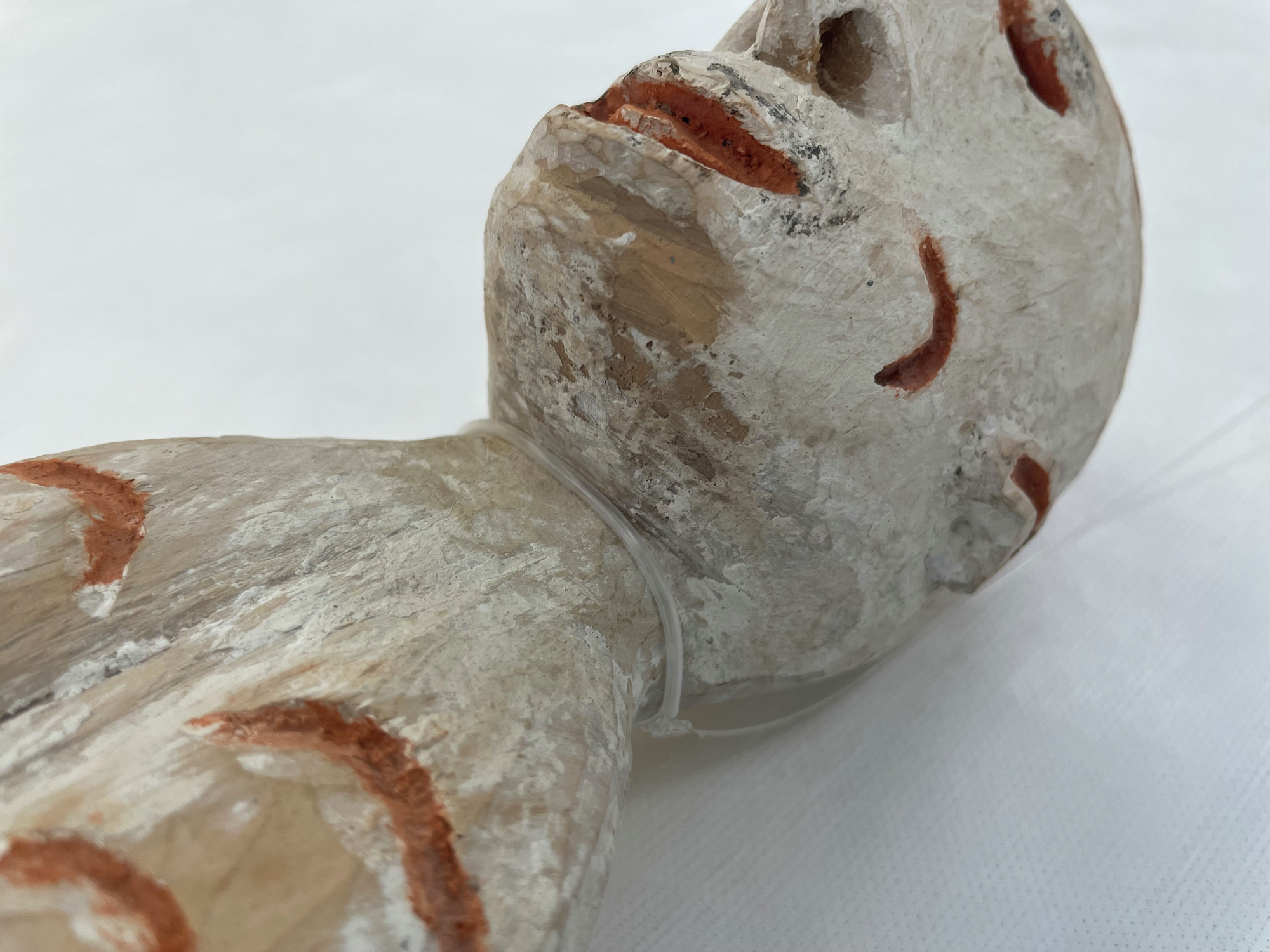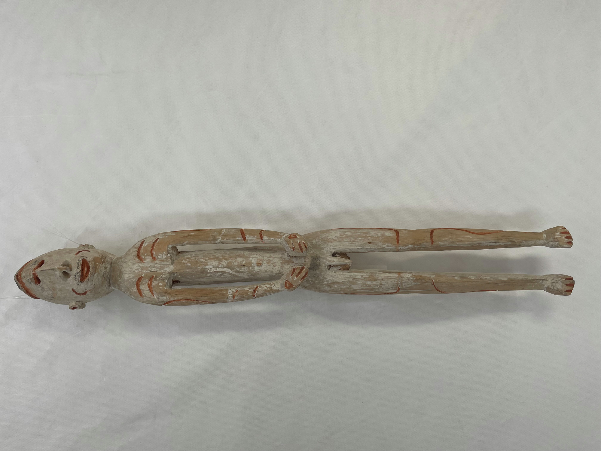 ETNOGRAFISKA MUSEET Djurgårdsbrunnsvägen 34 115 27 Stockholm Phone: +46 10 456 12 00, Fax: +46 10 456 12 97 infoldskulturmuseerna.se www.varldskulturmuseerna.se Org. Nr: 202100-5075 CONDITION STATEMENT FOR LOAN/EXHIBITION LOAN/EXHIBITION TITLE OR NUMBER: Kappsäcken: Bergman OBJECT NUMBER: 1960.15.0016 OBJECT DETAILS OBJECT TYPE: Skulptur NUMBER OF PARTS: 1 MATERIALS: Trä, mineral pigment DIMENSIONS (mm): 770 (l) x 95 (w) x 110 (d) ADDITIONAL INFORMATION: REQUIREMENTS LIGHT LEVEL: < 50 lux < 100 lux < 150 lux < 200 lux < 250 lux > 250 lux ENVIRONMENT: RH: 50 % RH Fluctuations:< 5 % per hour Temperature: 21 oC UV levels <75/lumen GENERAL CONDITION STATEMENT: Object has been on long-term display (since 2002) as part of Kappsäcken exhibition: Bergman case. Object is in good condition with a patchy white pigmentation overall. Surface dust overall. Object was mounted suspended from fishing line tied around neck. Mounting fishing line removed. Surface cleaned overall using non-contact puffer brush and light vacuum. MOUNTING INSTRUCTIONS: HANDLING INSTRUCTIONS: Please handle with care. Plant fibre decorative elements are embrittled, fragile, and prone to loss. SIGNATURE: CONSERVATOR: Peter McElhinney DATE: 09/02/2023 LENDER: DATE: GENERAL CONDITION STATEMENT AND COMMENTS AFTER LOAN/EXHIBITION: NOTES AND REMARKS: SIGNATURE: CONSERVATOR: DATE: LENDER: DATE: 1960.15.0016 Front BT 1960.15.0016 Back BT 1960.15.0016 right side BT 1960.15.0016 Left Side BT 1960.15.0016 Top BT 1960.15.0016 Bottom BT 1960.15.0016 detail BT showing mounting wire 1960.15.0016 detail AT showing removed mounting wire 1960.15.0014 detail BT showing mounting wire 1960.15.0014 detail AT showing removed mounting wireStäng