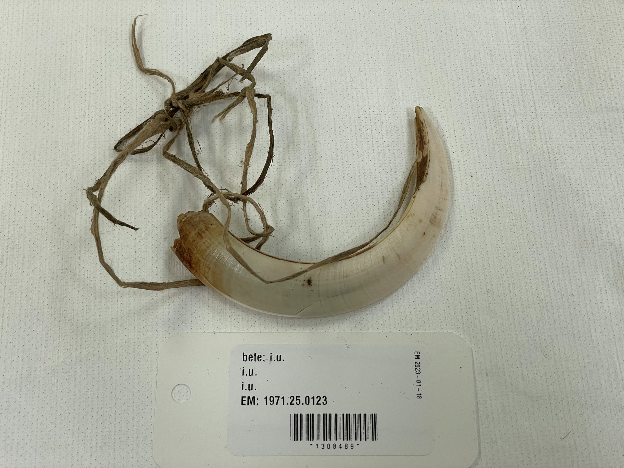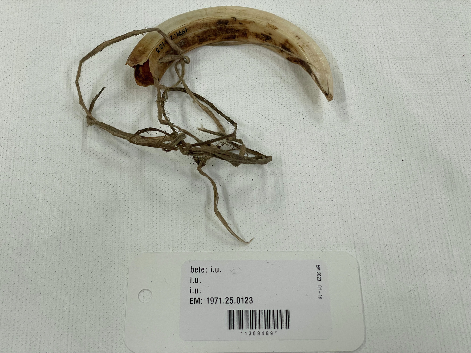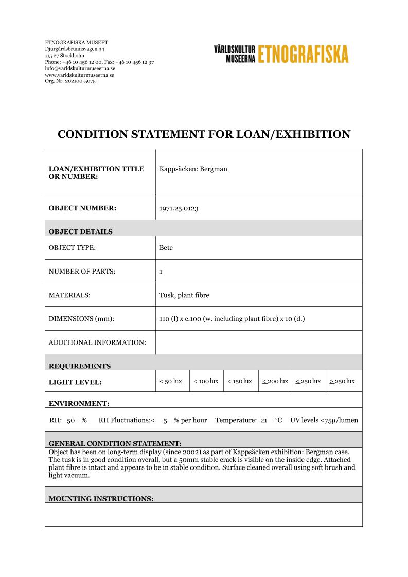 ETNOGRAFISKA MUSEET Djurgårdsbrunnsvägen 34 115 27 Stockholm Phone: +46 10 456 12 00, Fax: +46 10 456 12 97 infoldskulturmuseerna.se www.varldskulturmuseerna.se Org. Nr: 202100-5075 CONDITION STATEMENT FOR LOAN/EXHIBITION LOAN/EXHIBITION TITLE OR NUMBER: Kappsäcken: Bergman OBJECT NUMBER: 1971.25.0123 OBJECT DETAILS OBJECT TYPE: Bete NUMBER OF PARTS: 1 MATERIALS: Tusk, plant fibre DIMENSIONS (mm):...Visa hela