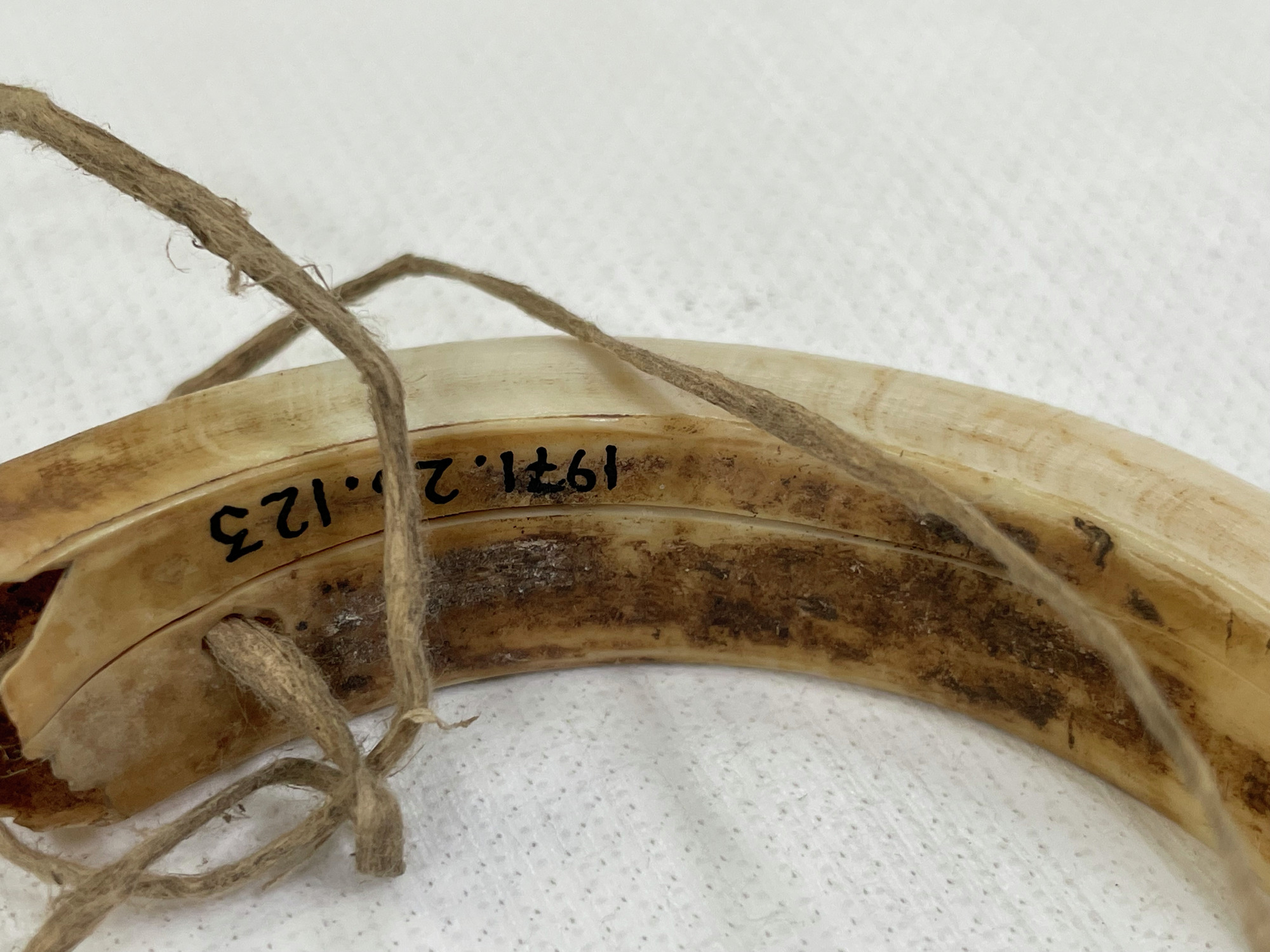 ETNOGRAFISKA MUSEET Djurgårdsbrunnsvägen 34 115 27 Stockholm Phone: +46 10 456 12 00, Fax: +46 10 456 12 97 infoldskulturmuseerna.se www.varldskulturmuseerna.se Org. Nr: 202100-5075 CONDITION STATEMENT FOR LOAN/EXHIBITION LOAN/EXHIBITION TITLE OR NUMBER: Kappsäcken: Bergman OBJECT NUMBER: 1971.25.0123 OBJECT DETAILS OBJECT TYPE: Bete NUMBER OF PARTS: 1 MATERIALS: Tusk, plant fibre DIMENSIONS (mm): 110 (l) x c.100 (w. including plant fibre) x 10 (d.) ADDITIONAL INFORMATION: REQUIREMENTS LIGHT LEVEL: < 50 lux < 100 lux < 150 lux < 200 lux < 250 lux > 250 lux ENVIRONMENT: RH: 50 % RH Fluctuations:< 5 % per hour Temperature: 21 oC UV levels <75/lumen GENERAL CONDITION STATEMENT: Object has been on long-term display (since 2002) as part of Kappsäcken exhibition: Bergman case. The tusk is in good condition overall, but a 50mm stable crack is visible on the inside edge. Attached plant fibre is intact and appears to be in stable condition. Surface cleaned overall using soft brush and light vacuum. MOUNTING INSTRUCTIONS: HANDLING INSTRUCTIONS: SIGNATURE: CONSERVATOR: Peter McElhinney DATE: 08/02/2023 LENDER: DATE: GENERAL CONDITION STATEMENT AND COMMENTS AFTER LOAN/EXHIBITION: NOTES AND REMARKS: SIGNATURE: CONSERVATOR: DATE: LENDER: DATE: 1971.25.0123 BT 1971.25.0123 BT 1971.25.0123 BT detail showing crack on tusk componentStäng