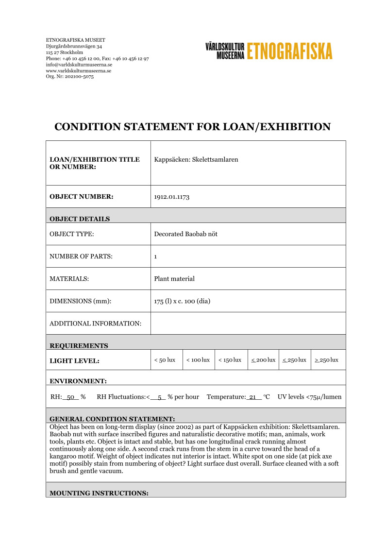 ETNOGRAFISKA MUSEET Djurgårdsbrunnsvägen 34 115 27 Stockholm Phone: +46 10 456 12 00, Fax: +46 10 456 12 97 infoldskulturmuseerna.se www.varldskulturmuseerna.se Org. Nr: 202100-5075 CONDITION STATEMENT FOR LOAN/EXHIBITION LOAN/EXHIBITION TITLE OR NUMBER: Kappsäcken: Skelettsamlaren OBJECT NUMBER: 1912.01.1173 OBJECT DETAILS OBJECT TYPE: Decorated Baobab nöt NUMBER OF PARTS: 1 MATERIALS: Plant mate...Visa hela