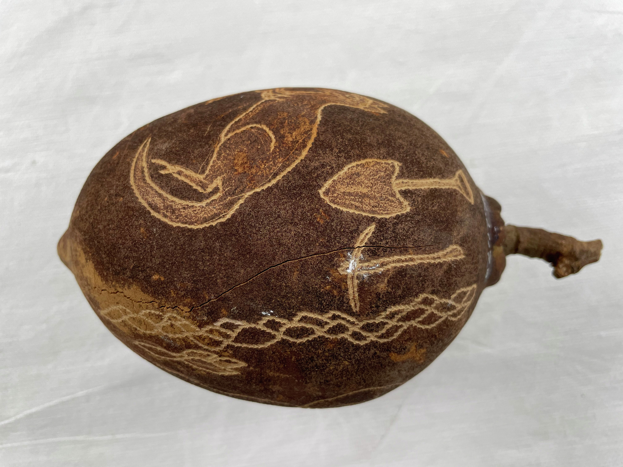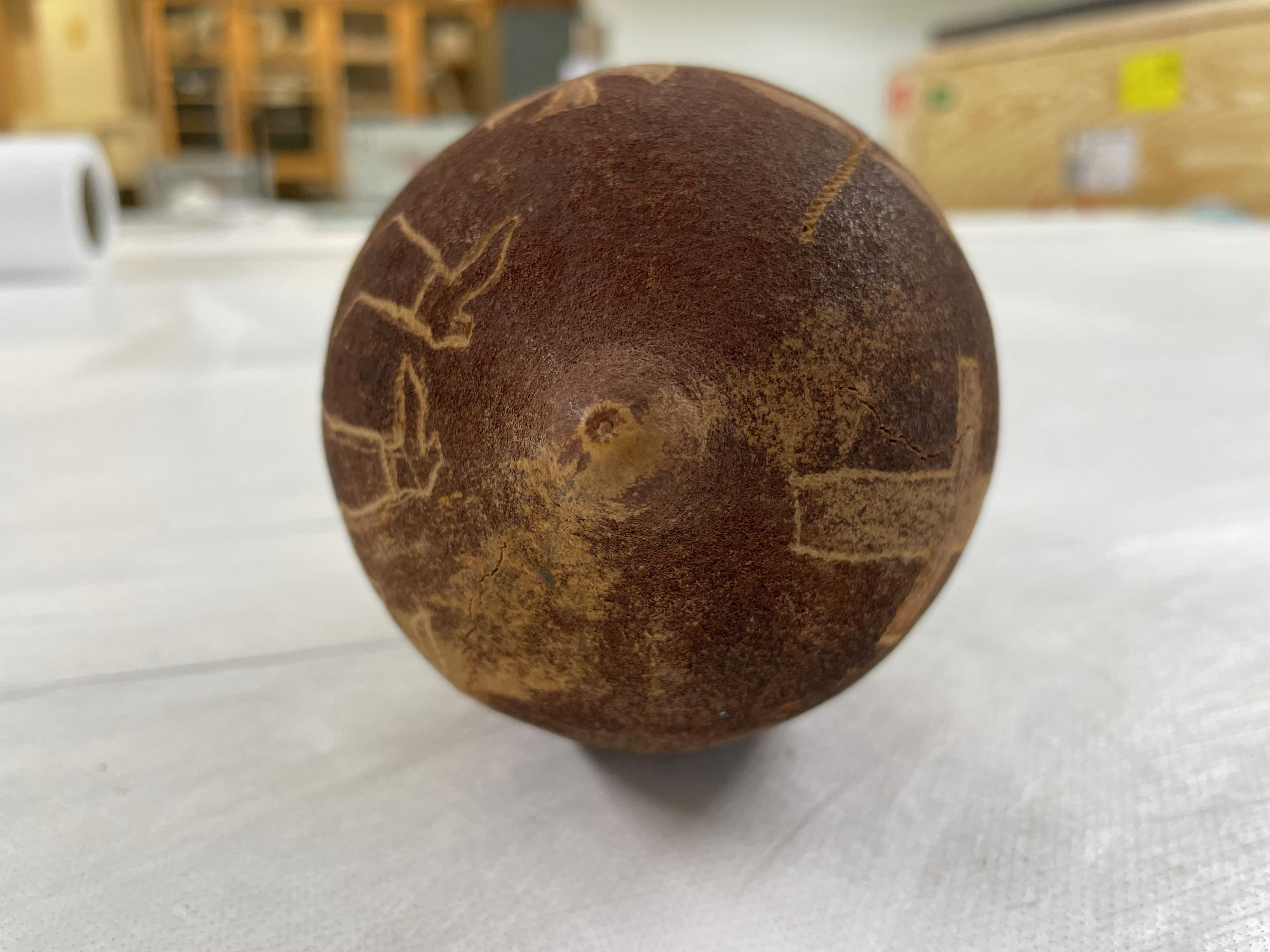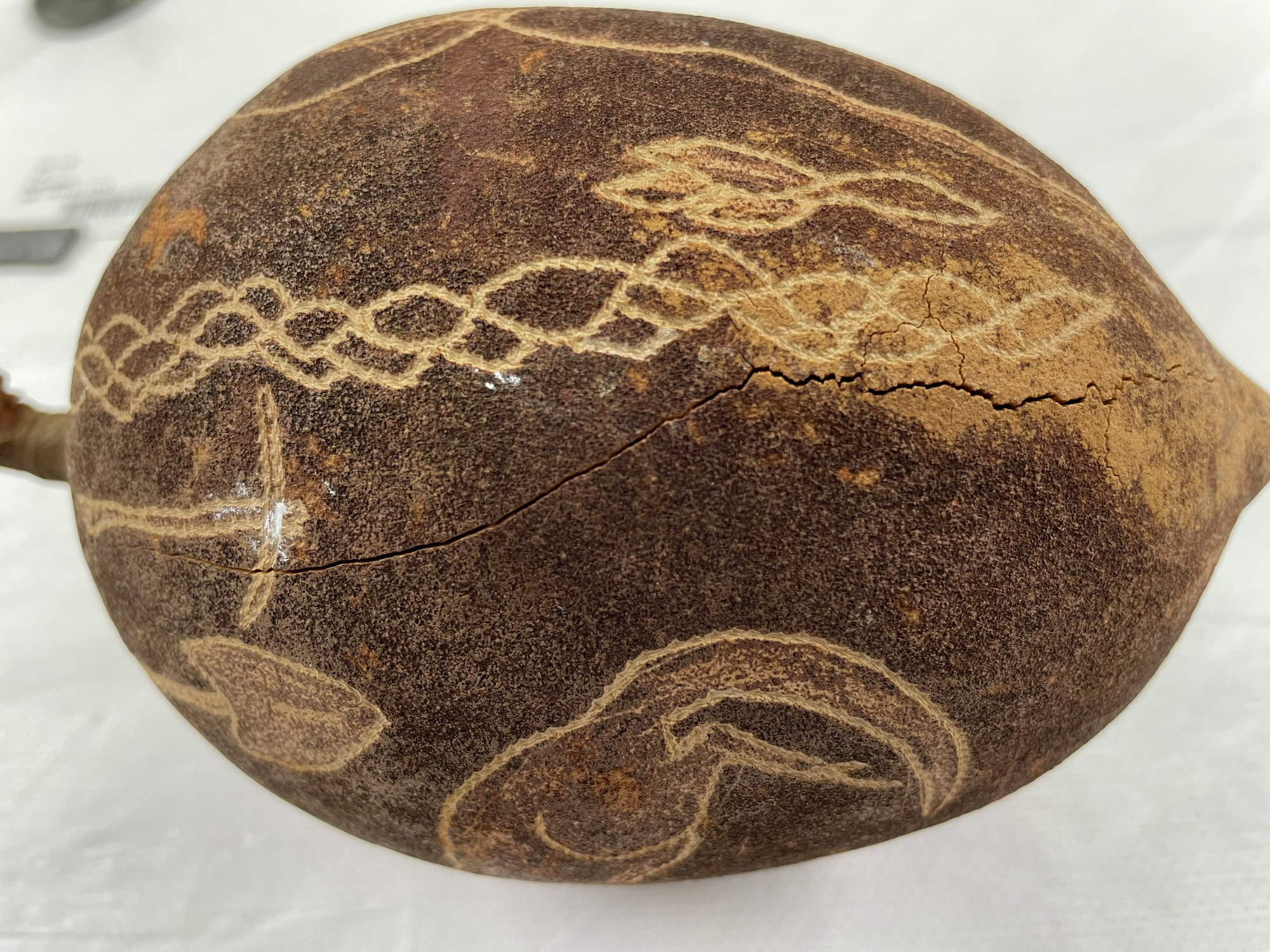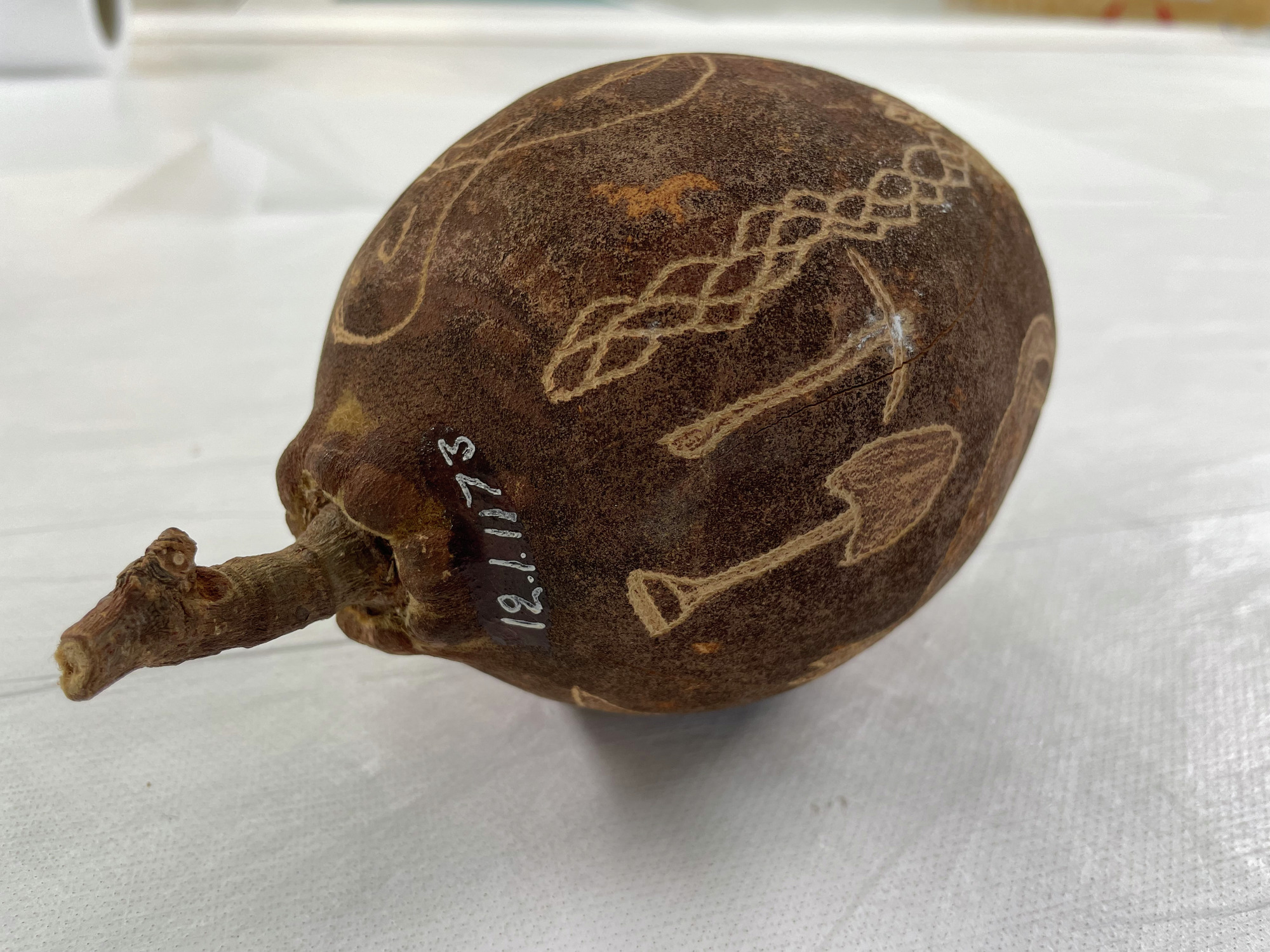 ETNOGRAFISKA MUSEET Djurgårdsbrunnsvägen 34 115 27 Stockholm Phone: +46 10 456 12 00, Fax: +46 10 456 12 97 infoldskulturmuseerna.se www.varldskulturmuseerna.se Org. Nr: 202100-5075 CONDITION STATEMENT FOR LOAN/EXHIBITION LOAN/EXHIBITION TITLE OR NUMBER: Kappsäcken: Skelettsamlaren OBJECT NUMBER: 1912.01.1173 OBJECT DETAILS OBJECT TYPE: Decorated Baobab nöt NUMBER OF PARTS: 1 MATERIALS: Plant material DIMENSIONS (mm): 175 (l) x c. 100 (dia) ADDITIONAL INFORMATION: REQUIREMENTS LIGHT LEVEL: < 50 lux < 100 lux < 150 lux < 200 lux < 250 lux > 250 lux ENVIRONMENT: RH: 50 % RH Fluctuations:< 5 % per hour Temperature: 21 oC UV levels <75/lumen GENERAL CONDITION STATEMENT: Object has been on long-term display (since 2002) as part of Kappsäcken exhibition: Skelettsamlaren. Baobab nut with surface inscribed figures and naturalistic decorative motifs; man, animals, work tools, plants etc. Object is intact and stable, but has one longitudinal crack running almost continuously along one side. A second crack runs from the stem in a curve toward the head of a kangaroo motif. Weight of object indicates nut interior is intact. White spot on one side (at pick axe motif) possibly stain from numbering of object? Light surface dust overall. Surface cleaned with a soft brush and gentle vacuum. MOUNTING INSTRUCTIONS: HANDLING INSTRUCTIONS: SIGNATURE: CONSERVATOR: Peter Mc Elhinney DATE: 04.07.23 LENDER: DATE: GENERAL CONDITION STATEMENT AND COMMENTS AFTER LOAN/EXHIBITION: NOTES AND REMARKS: SIGNATURE: CONSERVATOR: DATE: LENDER: DATE: 1912.01.1173 BT (note crack on this side) 1912.01.1173 BT 1912.01.1173 BT 1912.01.1173 BT 1912.01.1173 BT 1912.01.1173 BT 1912.01.1173 BT detail showing white paint spot on side of nut 1912.01.1173 BT detail showing longitudinal crack in nut shellStäng