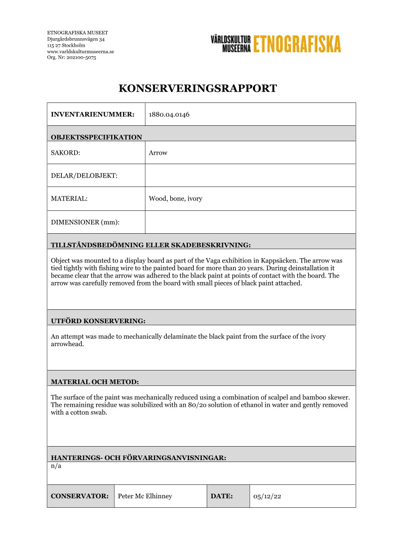 ETNOGRAFISKA MUSEET Djurgårdsbrunnsvägen 34 115 27 Stockholm www.varldskulturmuseerna.se Org. Nr: 202100-5075 KONSERVERINGSRAPPORT INVENTARIENUMMER: 1880.04.0146 OBJEKTSSPECIFIKATION SAKORD: Arrow DELAR/DELOBJEKT: MATERIAL: Wood, bone, ivory DIMENSIONER (mm): TILLSTÅNDSBEDÖMNING ELLER SKADEBESKRIVNING: Object was mounted to a display board as part of the Vaga exhibition in Kappsäcken. The arrow was tied tightly with fishing wire to the painted board for more than 20 years. During deinstallation it became clear that the arrow was adhered to the black paint at points of contact with the board. The arrow was carefully removed from the board with small pieces of black paint attached. UTFÖRD KONSERVERING: An attempt was made to mechanically delaminate the black paint from the surface of the ivory arrowhead. MATERIAL OCH METOD: The surface of the paint was mechanically reduced using a combination of scalpel and bamboo skewer. The remaining residue was solubilized with an 80/2o solution of ethanol in water and gently removed with a cotton swab. HANTERINGS- OCH FÖRVARINGSANVISNINGAR: n/a CONSERVATOR: Peter Mc Elhinney DATE: 05/12/22 ETNOGRAFISKA MUSEET Djurgårdsbrunnsvägen 34 115 27 Stockholm www.varldskulturmuseerna.se Org. Nr: 202100-5075 1880.04.0146 BT 1880.04.0146 ATStäng