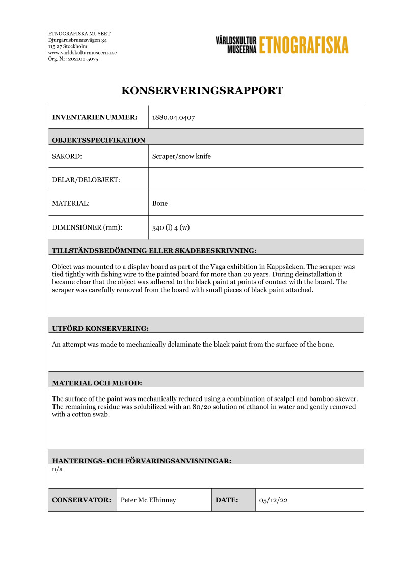 ETNOGRAFISKA MUSEET Djurgårdsbrunnsvägen 34 115 27 Stockholm www.varldskulturmuseerna.se Org. Nr: 202100-5075 KONSERVERINGSRAPPORT INVENTARIENUMMER: 1880.04.0407 OBJEKTSSPECIFIKATION SAKORD: Scraper/snow knife DELAR/DELOBJEKT: MATERIAL: Bone DIMENSIONER (mm): 540 (l) 4 (w) TILLSTÅNDSBEDÖMNING ELLER SKADEBESKRIVNING: Object was mounted to a display board as part of the Vaga exhibition in Kappsäcken...Visa hela