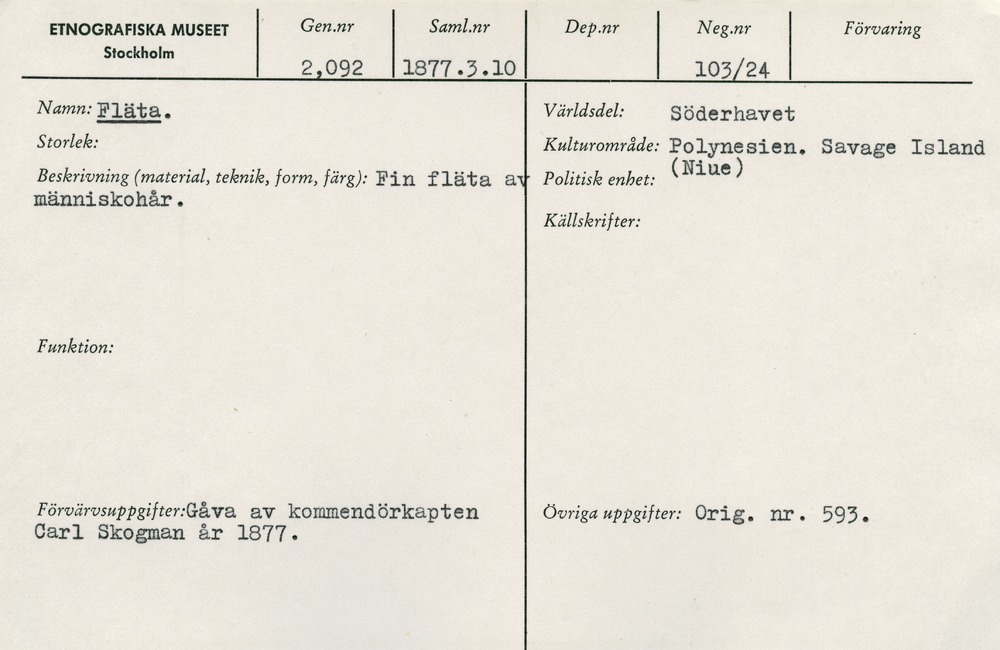 • Katalogkort ur Etnografiska museets arkiv.