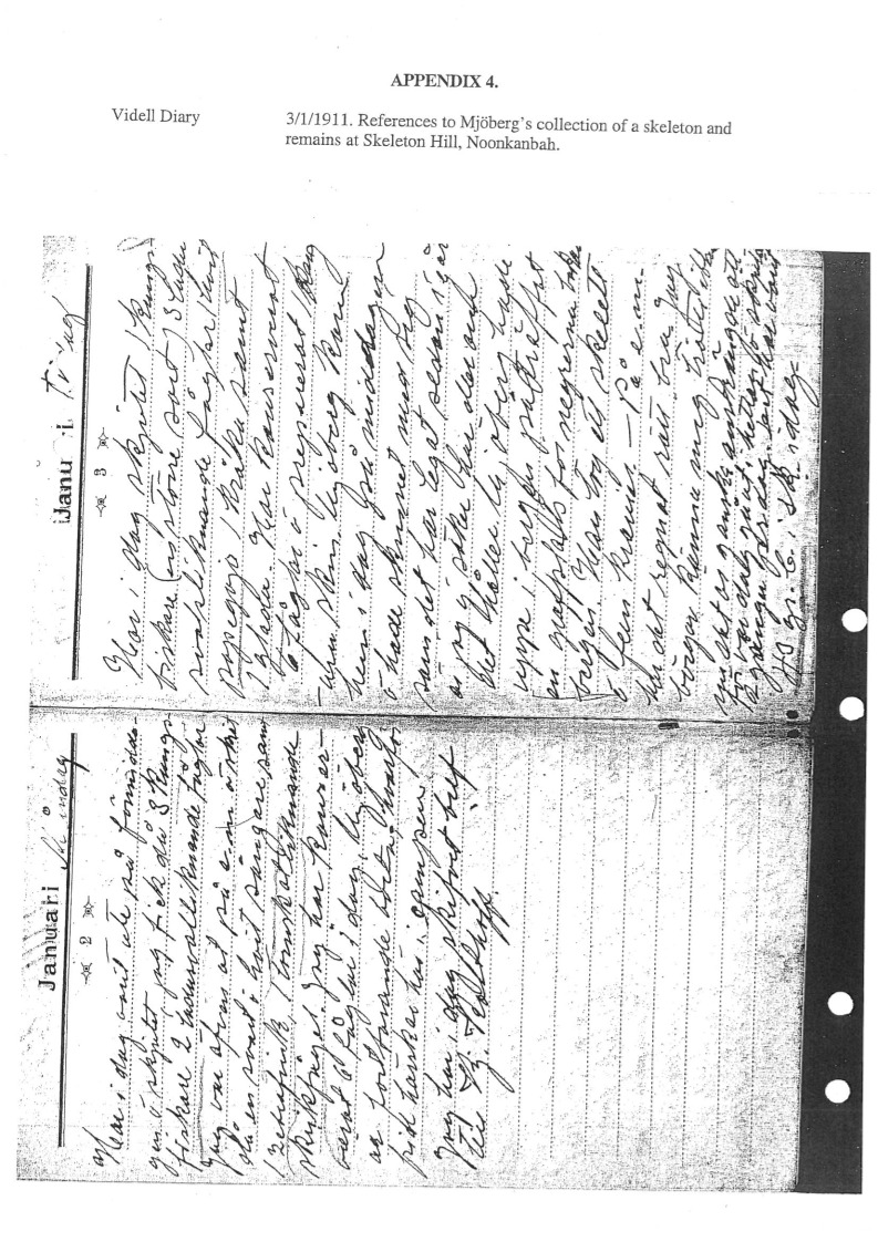 Kopior av sidor i dagböcker av Cyrus Vidal och Yngve Laurell samt brev från H. Wahlberg. Dessa kopior utgör appendix till Interimrapport av Clas Hallgren och Kim Akerman angående mänskliga kvarlevor från Australien i Etnografiska museets samlingar. Appendix 4 Videll Diary 3/1/1911 Appendix 5 Videll Diary 4/1/1911 Appendix 6 Videll Diary 22/2/1911 Appendix 7 Laurell Diary 3/7/1911 Appendix 8 Laurell Diary 4/7/1911 Appendix 9 Brev från H. Wahlberg angående samling 1894.05