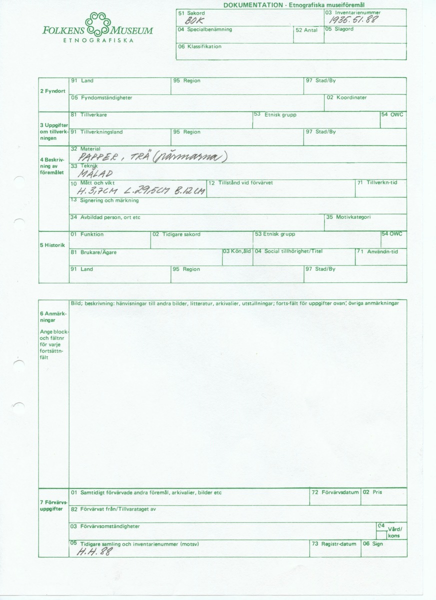 • Blankett ur Etnografiska museets arkiv.