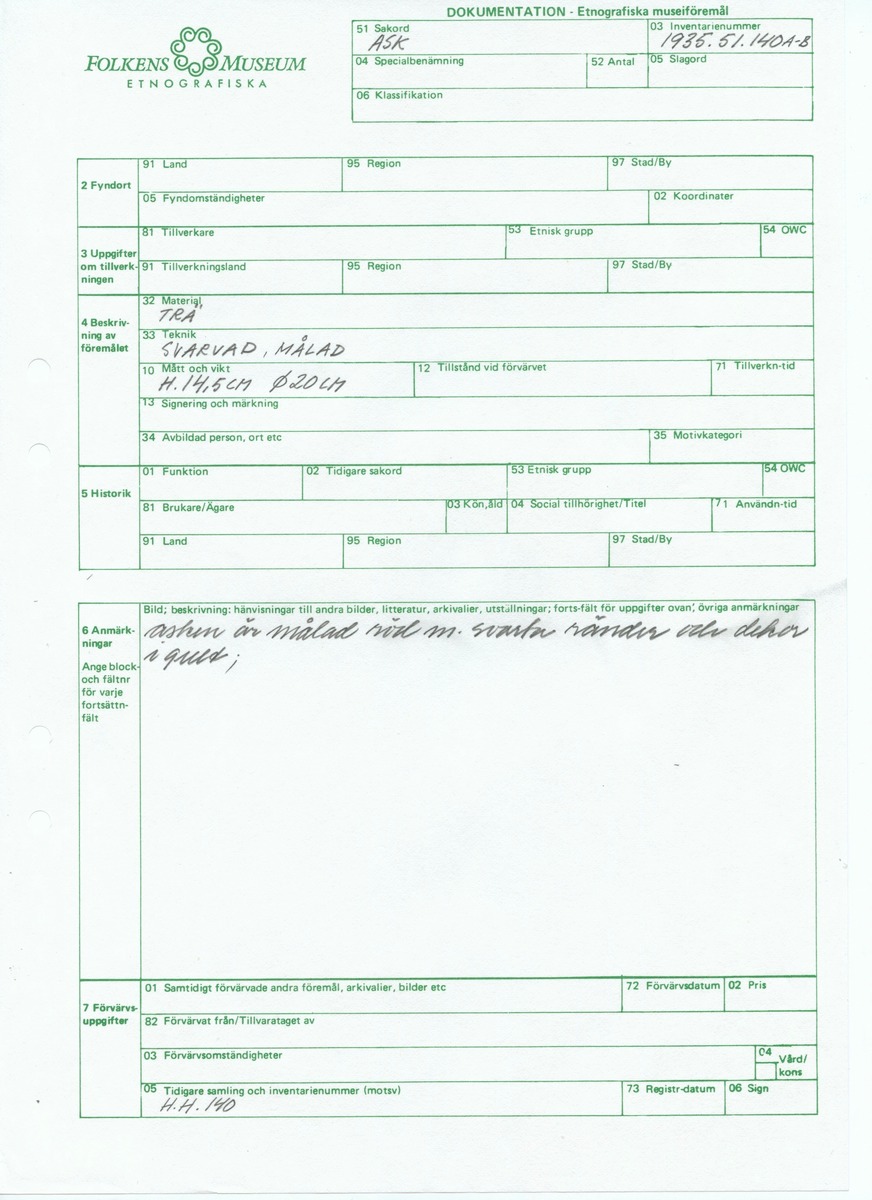 • Blankett ur Etnografiska museets arkiv.