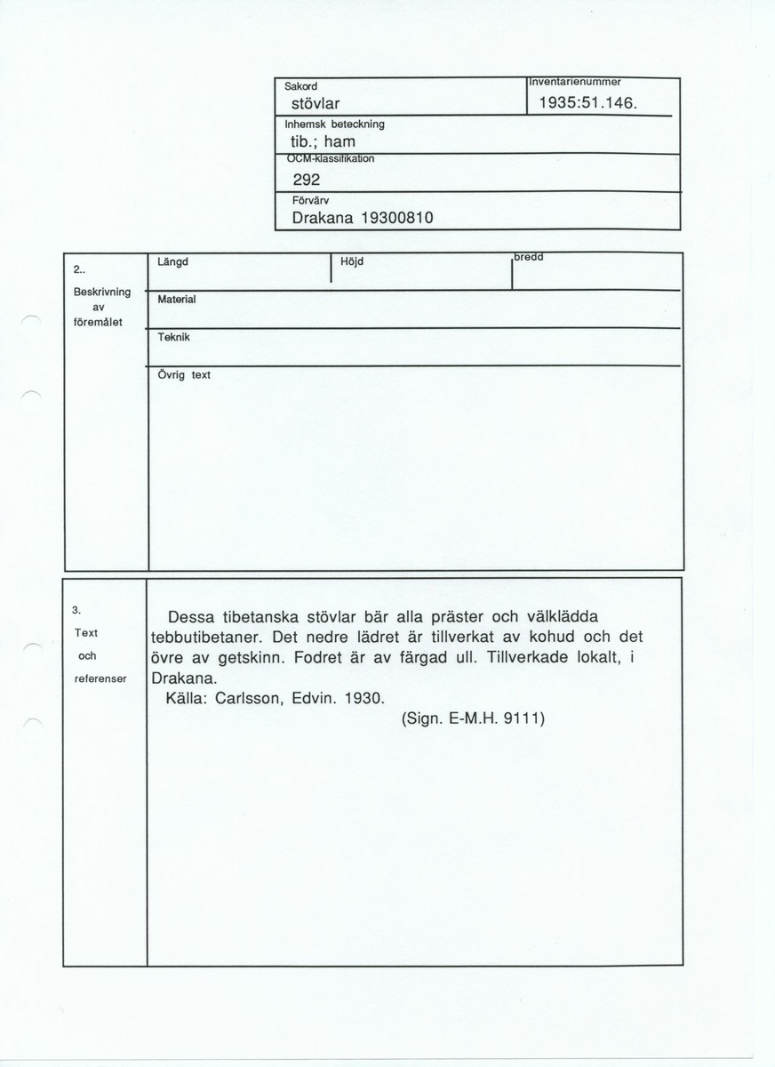 • Blankett ur Etnografiska museets arkiv.