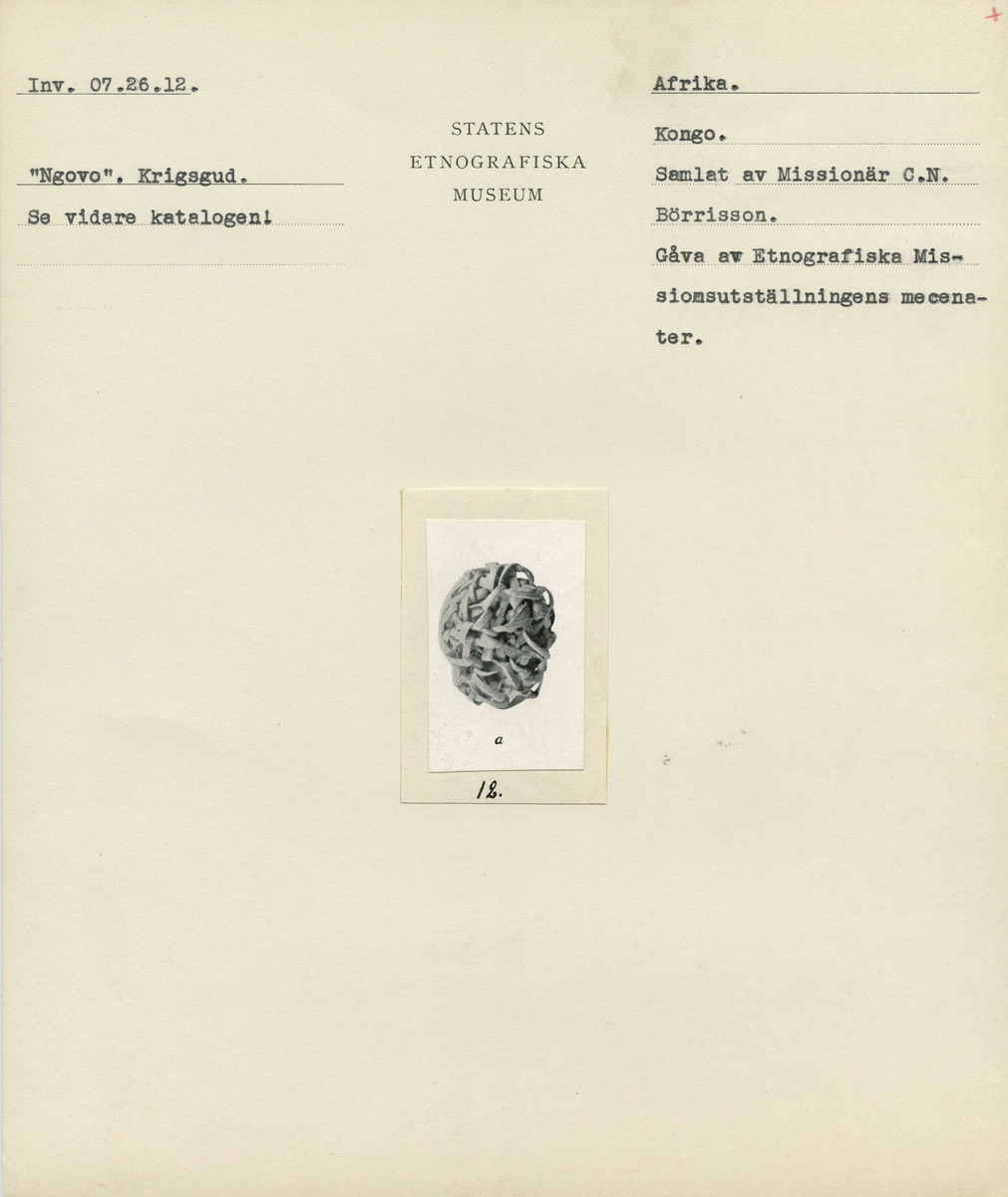• Katalogkort ur Etnografiska museets arkiv. Dokumentation av föremålssamling.