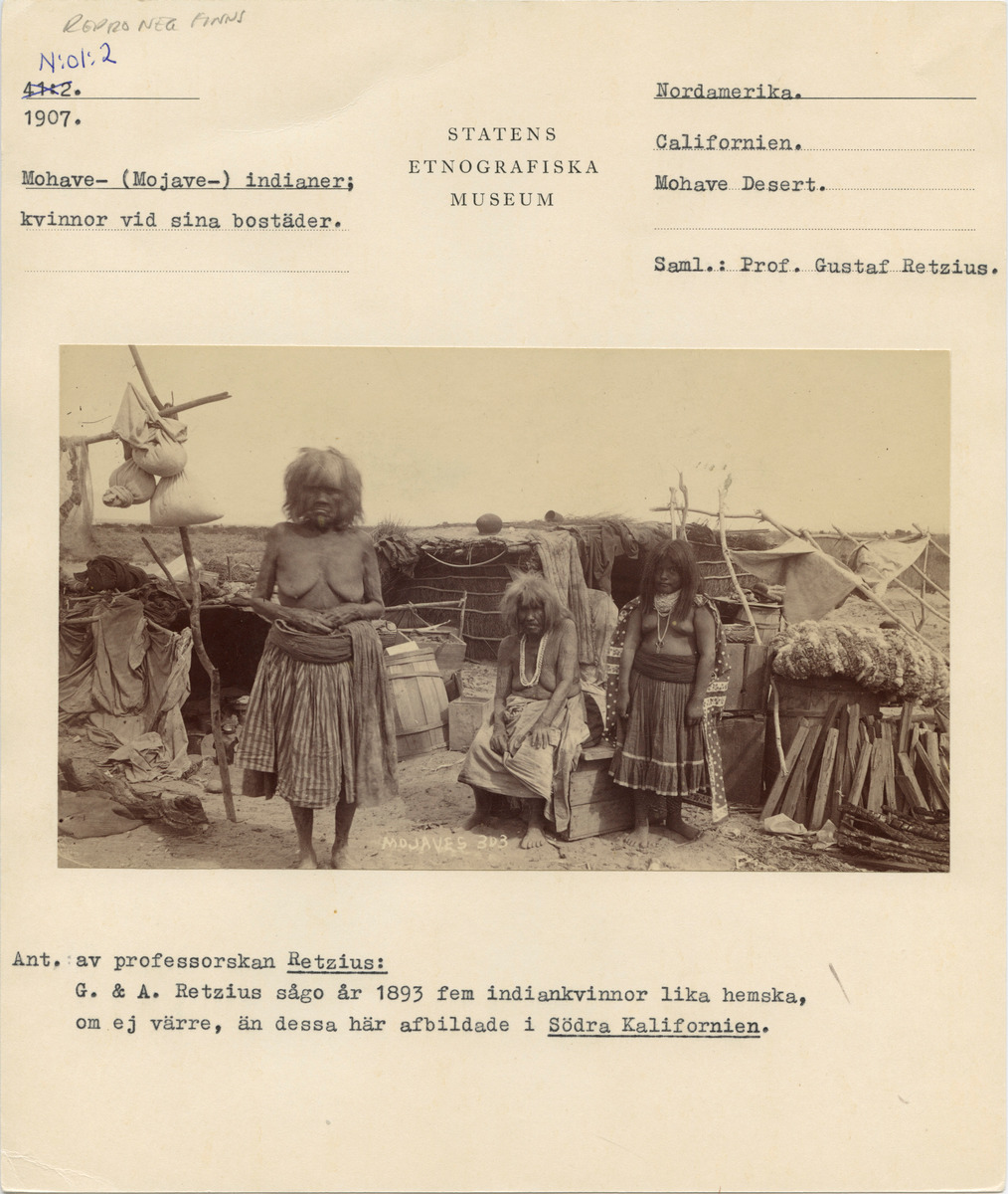 • ”Gustaf & Anna Retzius såg år 1893 fem indiankvinnor lika hemska, om ej värre, än dessa här avbildade i södra Kalifornien”. (Antecknat av professorskan Retzius 1907, se katalogkort)