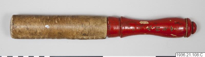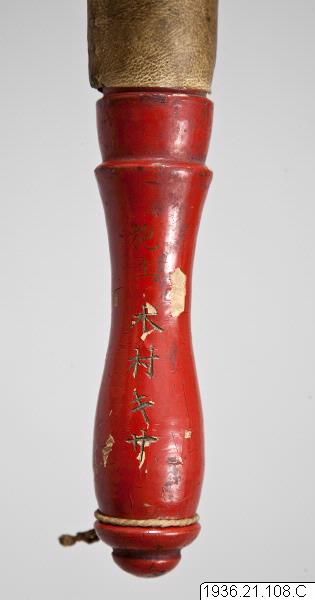 Trumpinne av rödlackerat trä med ett långt huvud klätt med ljust läder. Japanska skrivtecken på skaftet.