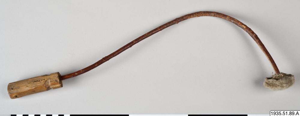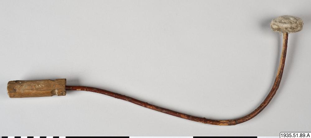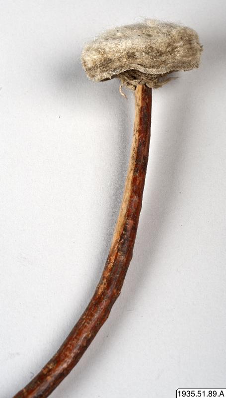 • Trumpinne av trä, böjd. Huvud av läder och växtfiber.