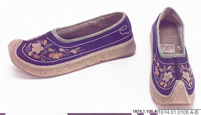 Sko klädd med mörkblå sidensatin och dekorerad med broderi av silkes-och metalltråd. Inuti fodrad med vitt bomullstyg i tuskaft. Tjock sula av vit filt (?) i flera, sammanpressade lager, underst en sula av ljust brunt skinn. Sulan är spetsig och uppböjd vid tån. Hårda, tygbeklädda , vita kanter runt hela sulan. "Inuti skon en fastklistrad lapp med texten "Chinesiska ........(?) skor".