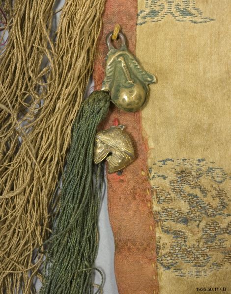 Förkläde, del av dräkt, av gult siden med cirkelformade mönster placerade i ränder. Förklädet är sytt av två rektangulära tygbitar som kantats med ett blått sidentyg och hopsydda med ca en decimeter lång söm. Längs sprundet mitt fram och längs nederkanten sitter långa tofsar i olika färger samt bjällror. Flera tofsar och bjällror saknas. Högst upp en linning av bomullstyg. [[Textil]]
