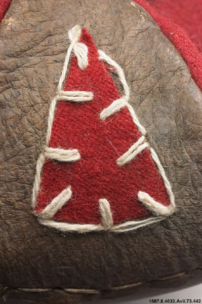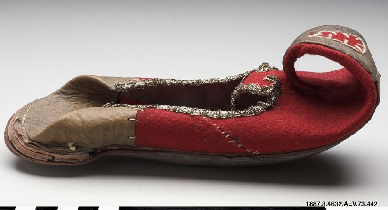 Ett par kvinnoskor, i skinn, klädda med röd textil över större delen av ytan. Bakkappan är nedtrampad i skon, tåspetsen har kraftig uppåtböjning, böjen har på utsidan dekorerats med en bit röd textil. Skornas öppning är kantad med ett band i silvertråd. Flera identiska par tidigare uppackade, dessa i gott skick till skillnad från de andra.