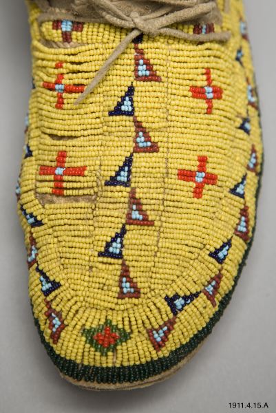Mockasiner, ett par av kläde enligt generalkatalogen, men är tillverkade av skinn. Broderade med gula, gröna, blå, röda och orange glaspärlor. Ordet mockasin kommer från algonkinspråkfamiljen. I stort sett alla indianer i Nordamerika norr om Mexico använde mockasiner, med undantag från området utmed gränsen till Mexico och Stilla Havskusten. Prärieindianerna hade vanligtvis en hård, kraftigare råhudssula med en mjukare behandlad överdel av "buckskin". Mockasinerna dekorerades med quillarbete, "pärlor", tyg, knappar och päls. Dekorationen skilde sig åt mellan olika folk. Kvinnorna gjorde mockasinerna och män som var ute på en längre färd eller jakt hade flera par med sig./SB, ASH För vidare information om mockasiner, se Colin F. Taylor, sid 61, samt speciellt om lokala skillnader i utformning, se Ronald P. Koch, kap 13.