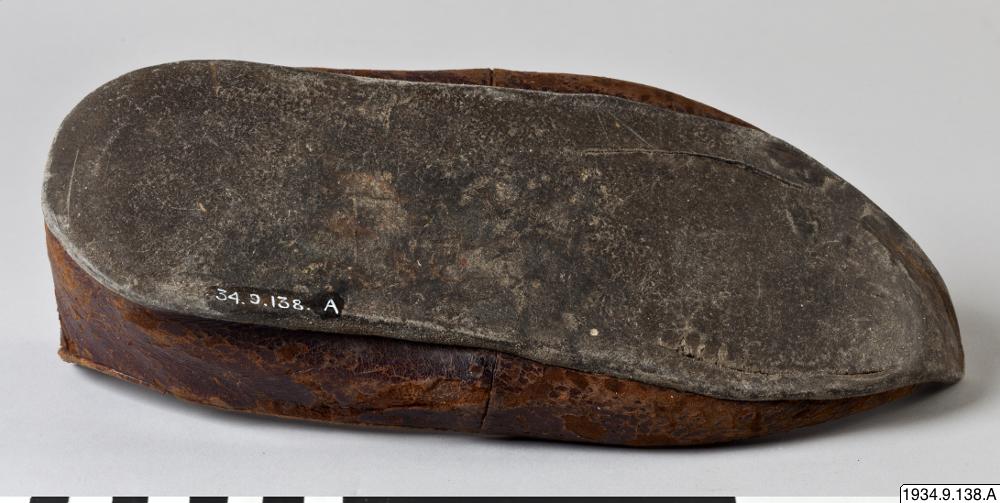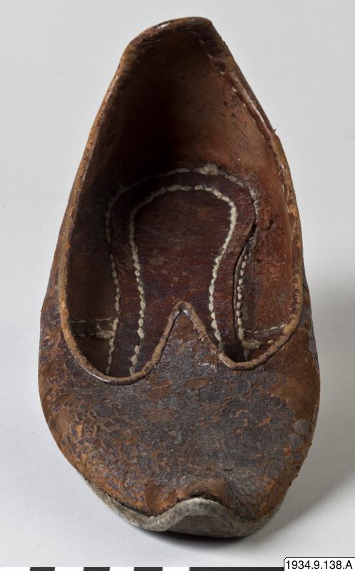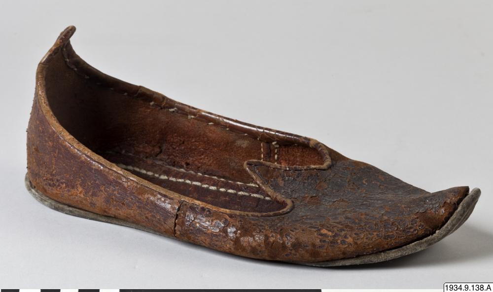 • Tofflel av läder. Framtill slutande i en något uppåtböjd spets och baktill i en uppstående kappa.