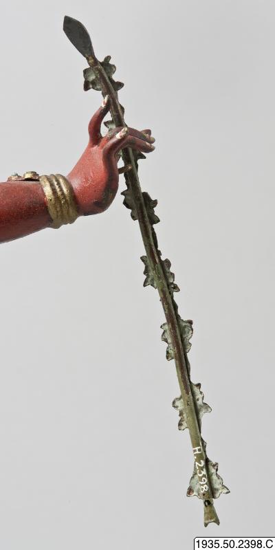 • En shara, pil, som sitter i skulpturens sekundära högra hand. Pilens skaft är prydd med blommor, vitmålade med rosa detaljer och grönmålade blad.