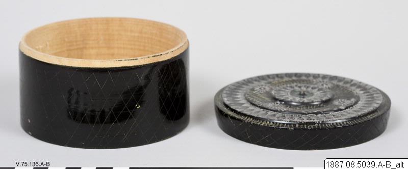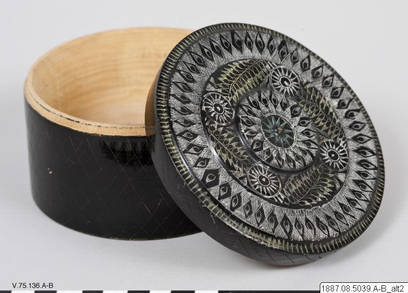 • Ask av trä, svarvad, svartgrön med ristade korsande linjer. (generalkatalogen)