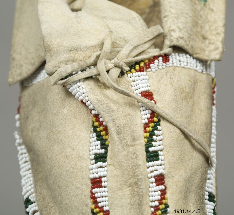• Mockasin av ljust, sämskat skinn med pärlbroderi i vitt, gult, grönt och rött. Sulan, av ogarvat läder, har på undersidan spår av behåringen. Snittet påverkat av europeiska skodon.