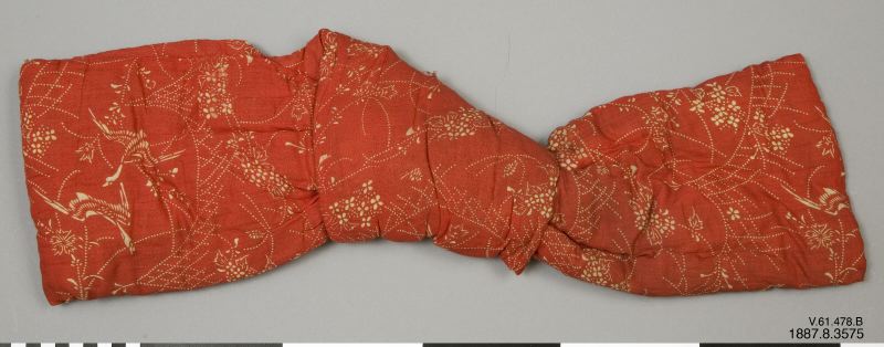 Obi av rött bomullstyg med fågelmönster i schablonmönstring. (söndersprättad). (generalkatalogen) Vadderad med bomullsvadd och knuten i rosettform. Har förmodligen suttit på ett band.