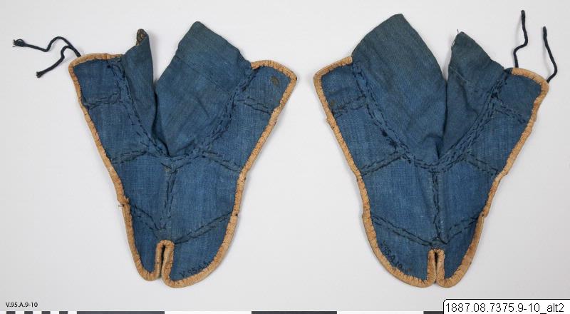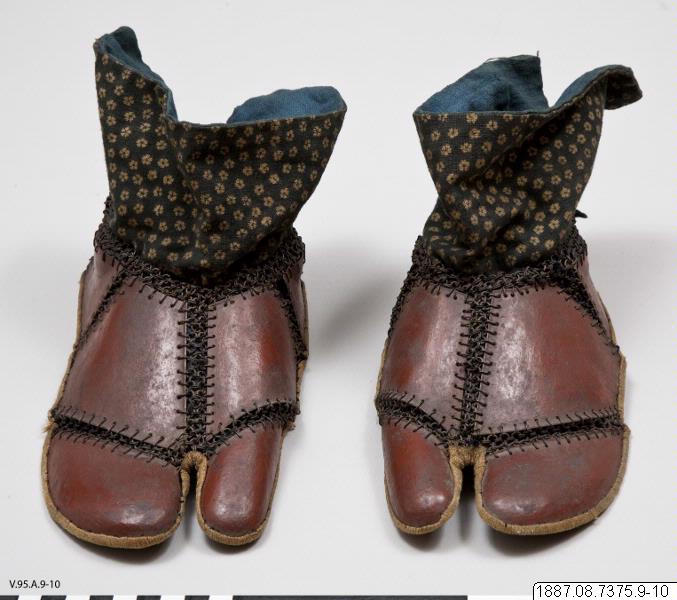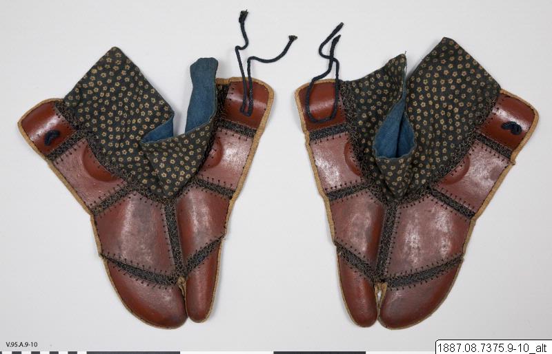 Skoskydd, del av samurajrustning. Skydd för ovansidan av höger fot. Består av rödlackerade lameller sammanfogade med ringar på ett foder av blå textil med gult mönster. Undersidan fodrad med blå textil. Blå silkessnoddar som knytband.