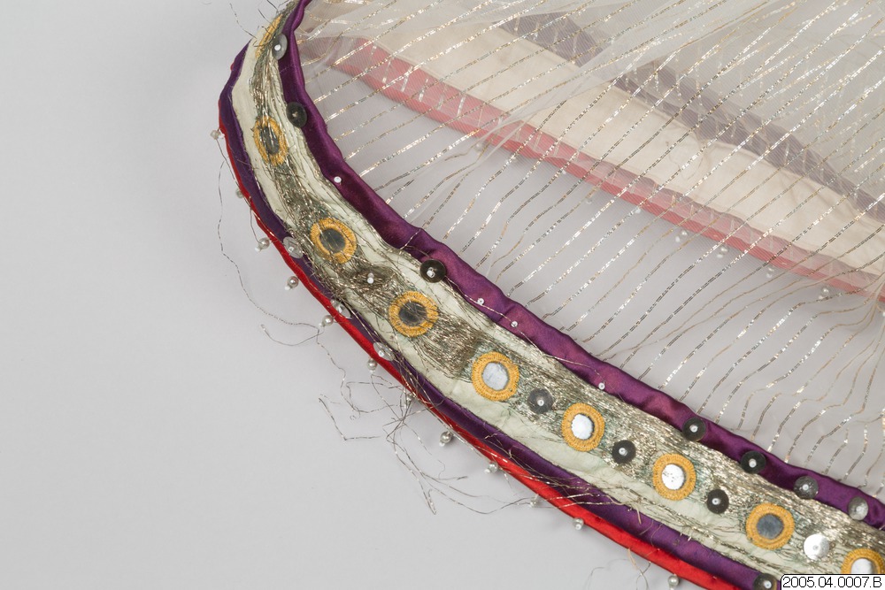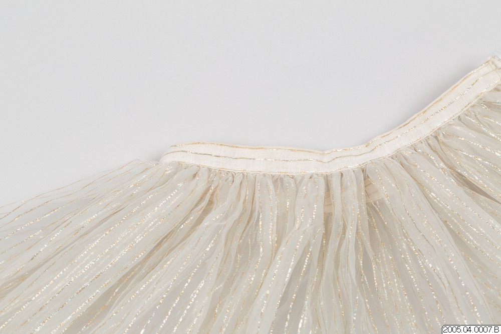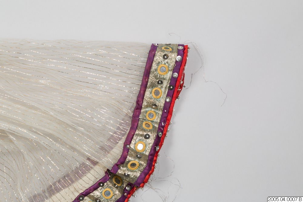 Dansdräkt som som kommit till museet genom gåva av f.d. chefen för Dansmuseet Bengt Häger. Dräkten har tillhört hustrun Lilavati som är den indiska klassiska 1900-tals dansens förgrundsfigur. Ett 20-tal dräkter ingår i gåvan, klassiska indisk dräkt, och dräkt som övrgår mot modern indisk dans. Lilavati kom till Sverige på 1950-talet, och har gjort ett stort antal föreställningar. Kjol att använda i hop med 2005.4.7.A. av vit syntetfiber. I nedrekant en bård av metalltråd och spegelbroderier, även metallpaljetter och pärlor. I bården är insytt en ten för att styva upp vidden på kjolen.