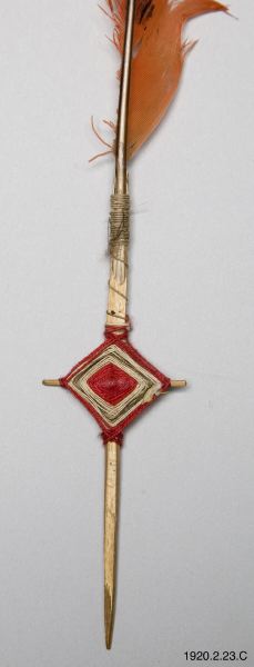 • Paket med tre röda fjädrar hör ihop med huvudprydnaden. B. och C. har förstärkning av en träpinne vid fästet. Även en tvätgående pinne där tråd lindats i ett mönster.