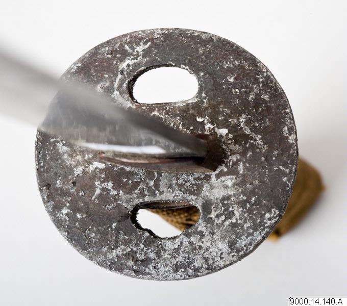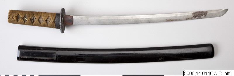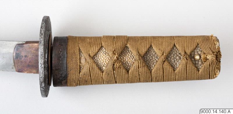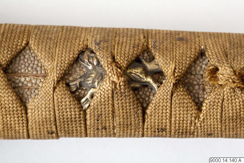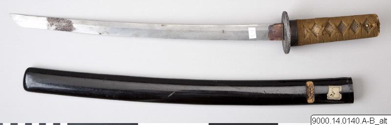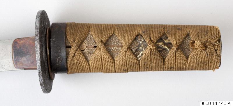 Svärd med svagt böjd klinga. Fästet klätt med vitt hajskinn och omlindat med gulaktiga silkesband. Prydnad (menuki) i brons på ena sidan fästet. Odekorerad parerplåt (tsuba) med spår av vitmetall. Ändbeslag (kashira) saknas.
