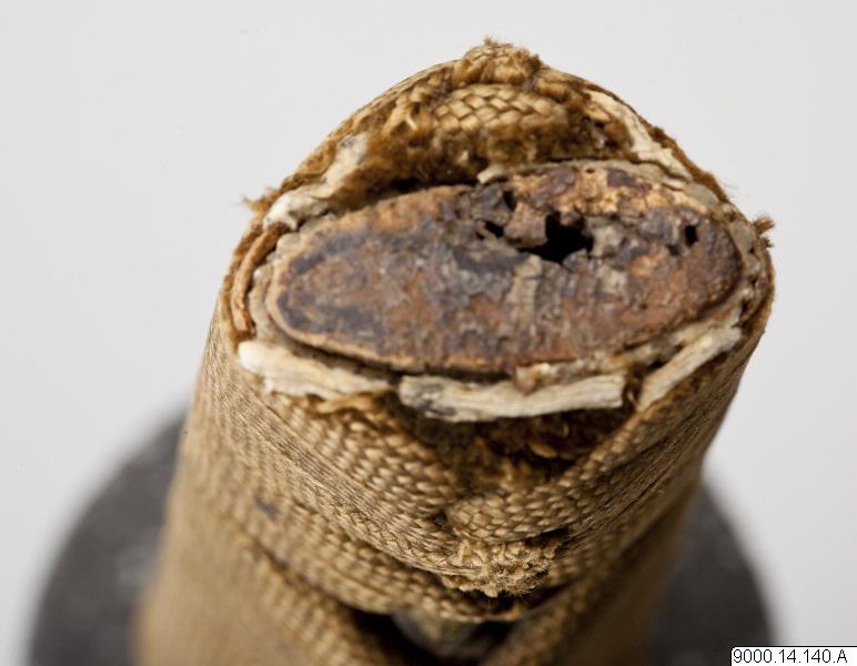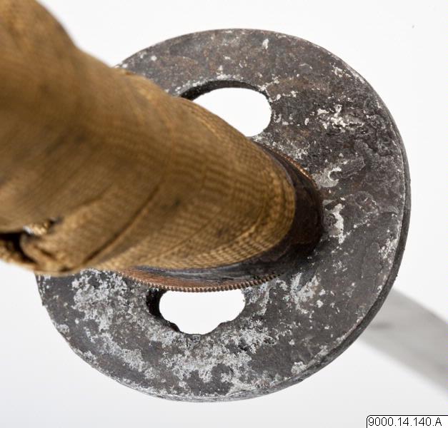 Material är kompletterat med skinn från rocka eftersom detta material oftast används till grepp på svärd/vapen. Tidigare har materialet oftast benämnts som "hajskinn". 2015-06-29/MJ