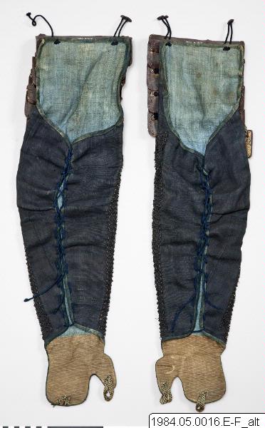 Armskydd till rustning, vänster arm. Brunlackerade lameller på överarmen, brynja på resten. Även lameller på handsken. Sammanfogade av mörkblå snören. Undersidan blå textil.