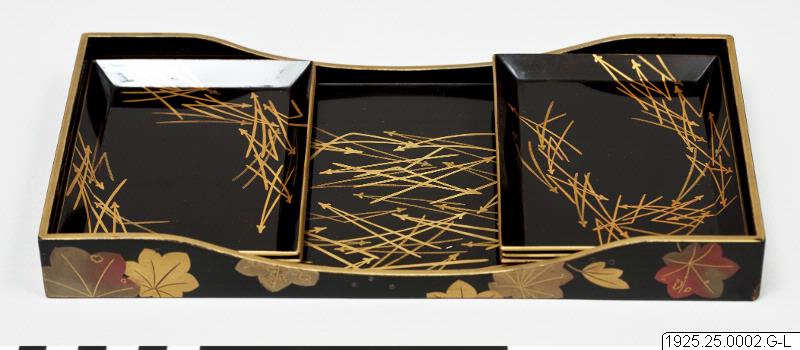Liten tallrik av svartlackerat trä. Invändigt dekorerad med förgyllt tallbarrsmotiv (matsuha). En av fem tallrikar.