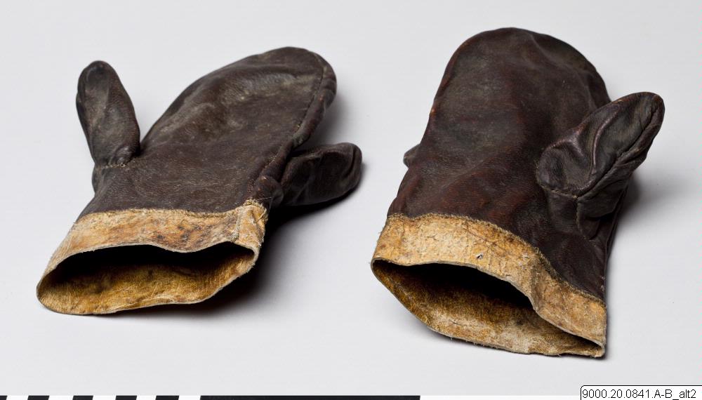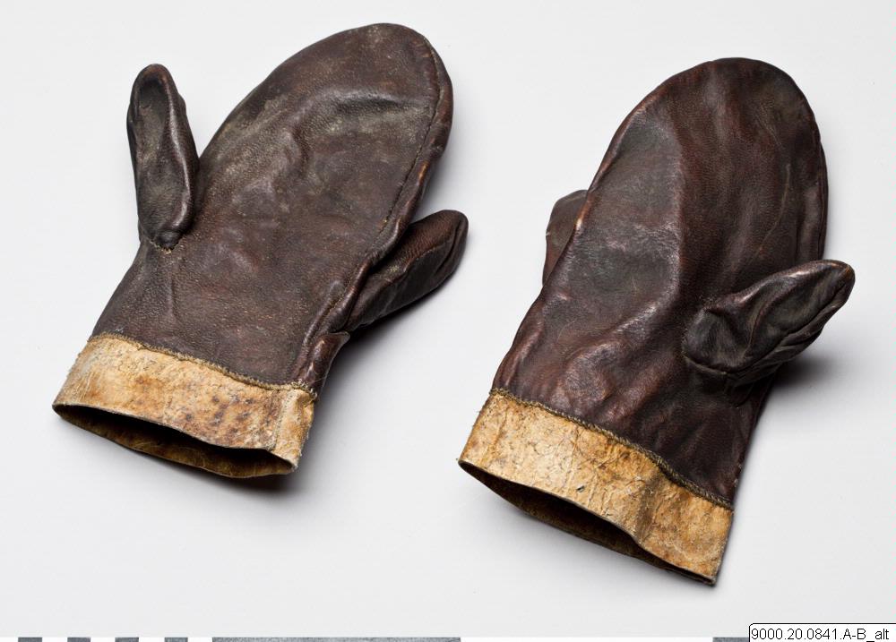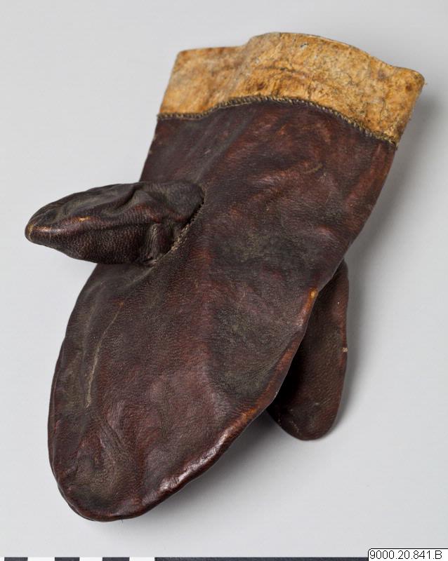• Tumsvante av brunt skinn med dubbla tummar (för att kunna byta grepp vid väta?). Remsa av ljusare skinn fastsytt runt öppningen.