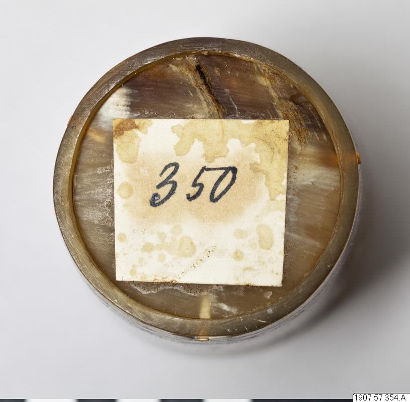 • Dosa av horn. Svagt avsmalnande mot botten. Inläggningar med silver.